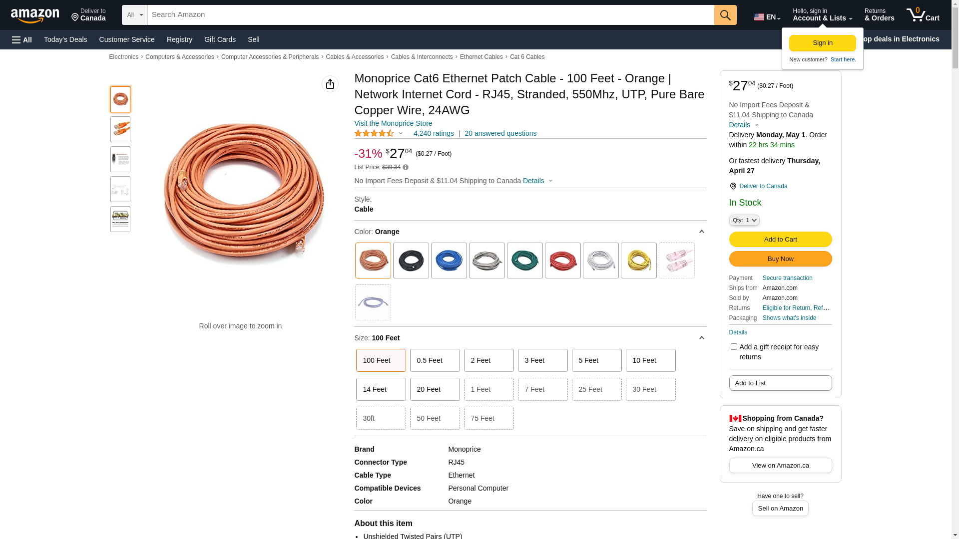 Monoprice 100-Feet 24AWG Cat6 550MHz UTP Ethernet Bare Copper Network Cable, Orange (103418). High quality Category 6...