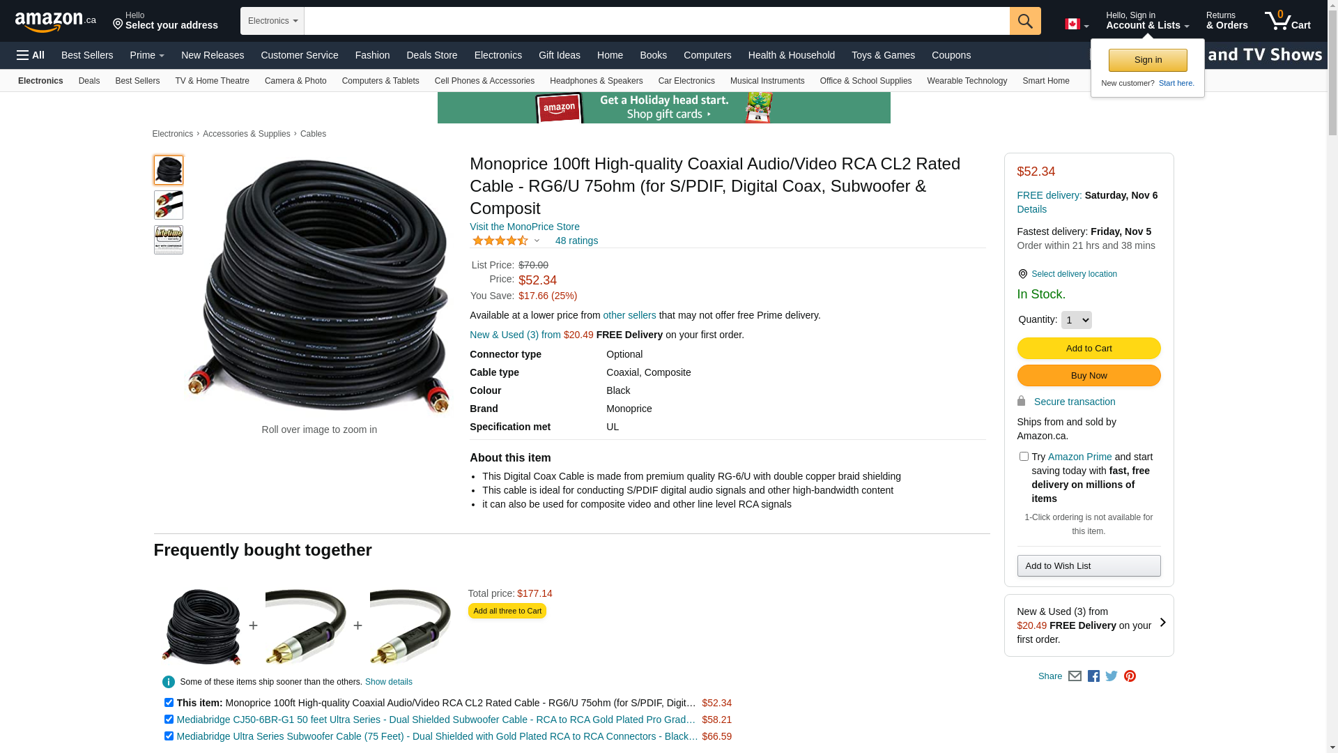 Monoprice 100ft High-quality Coaxial Audio/Video RCA CL2 Rated Cable - RG6/U 75ohm (for S/PDIF, Digital Coax, Subwoofer & Composit: Maxedbuy.com