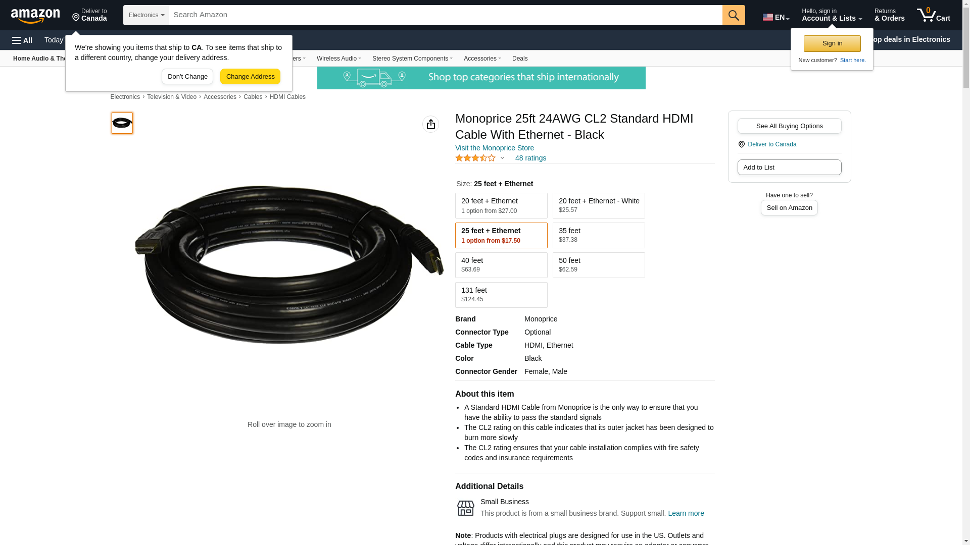 Monoprice 25ft 24AWG CL2 Standard HDMI Cable With Ethernet - Black