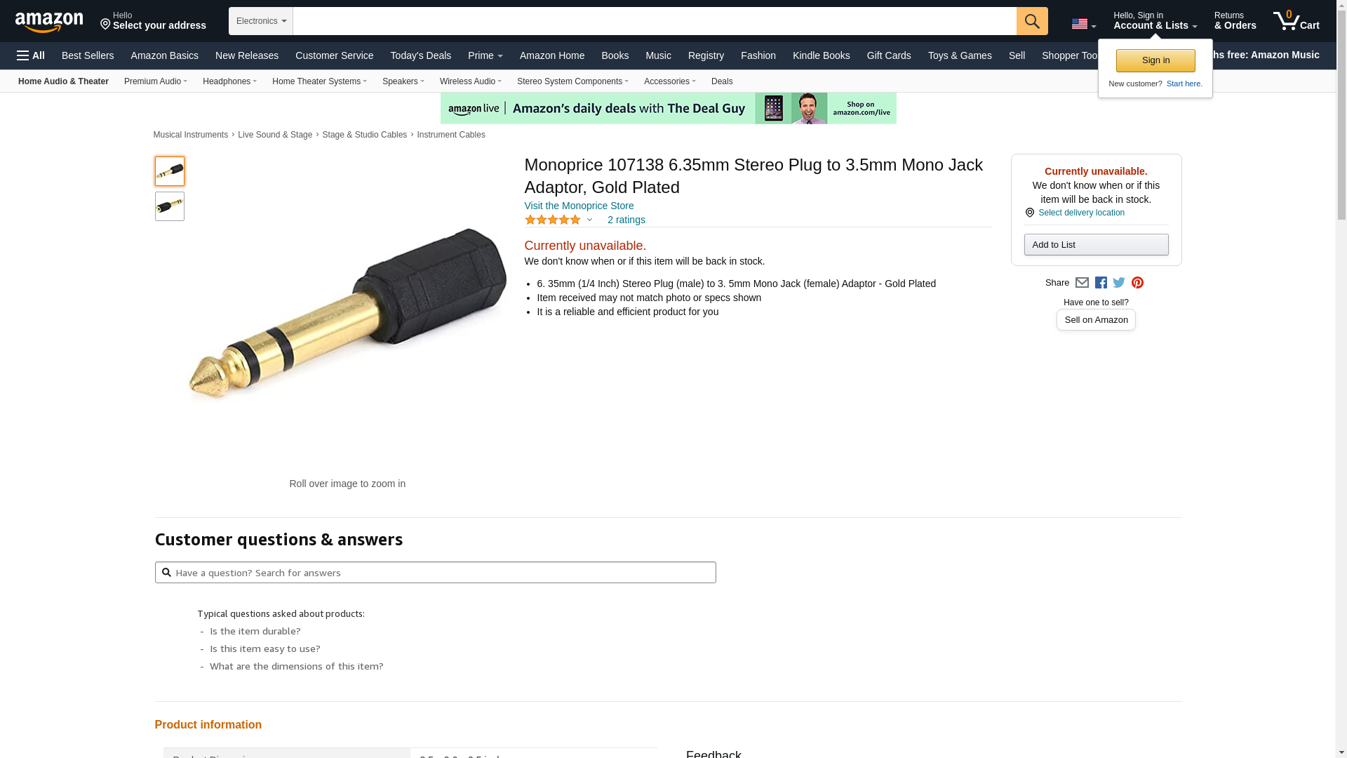 | Feature | 6. 35mm (1/4 Inch) Stereo Plug (male) to 3. 5mm Mono Jack (female) Adaptor - Gold Plated |