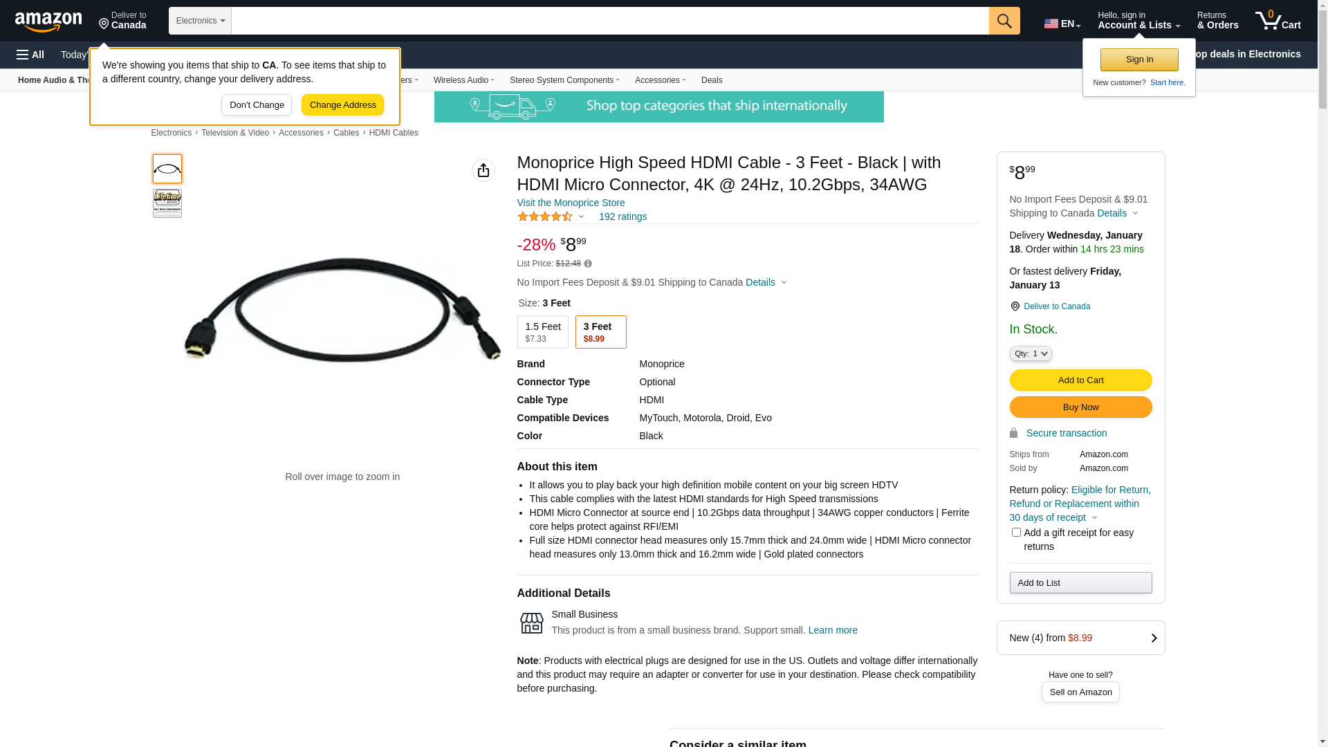 Monoprice High Speed HDMI to HDMI Micro Cable - 4K@24Hz, 10.2Gbps, 34AWG, Ferrite Core, Gold Plated Connectors, 3 Feet, Black