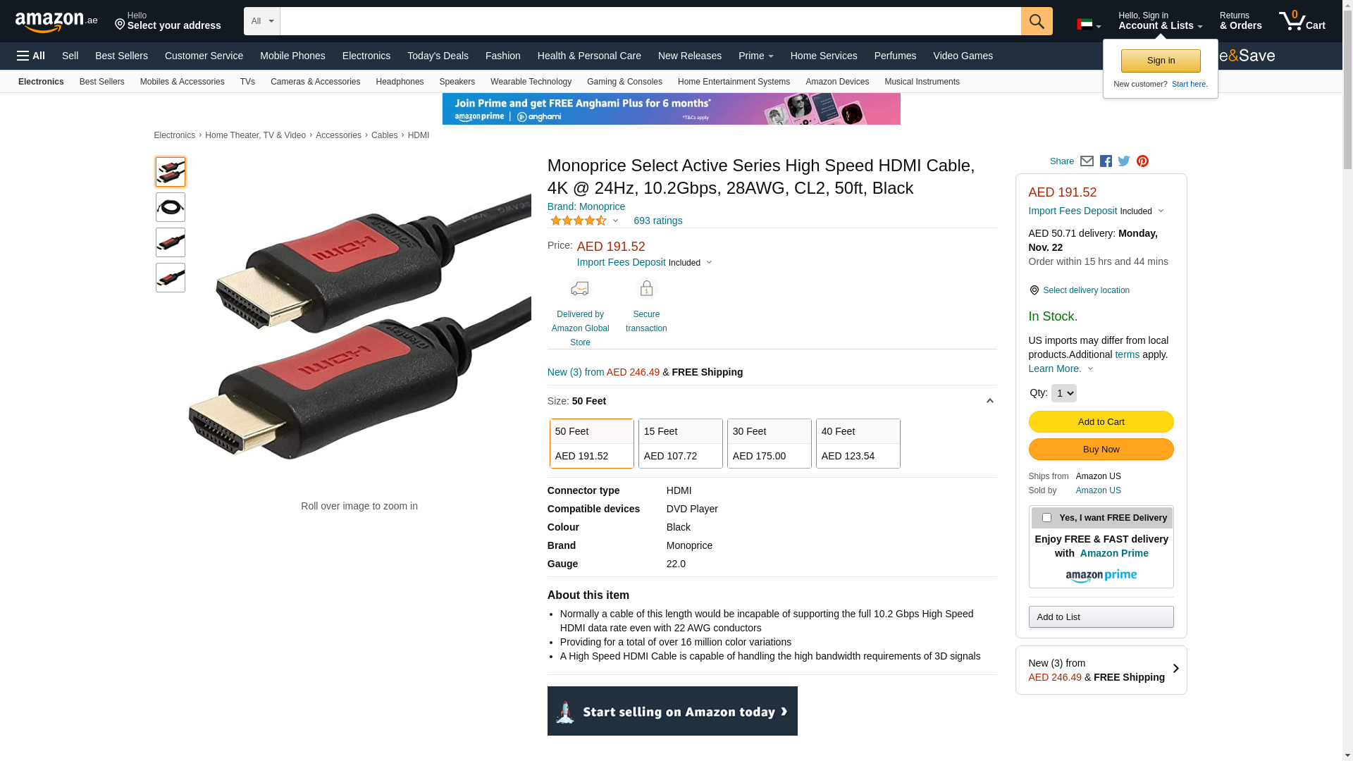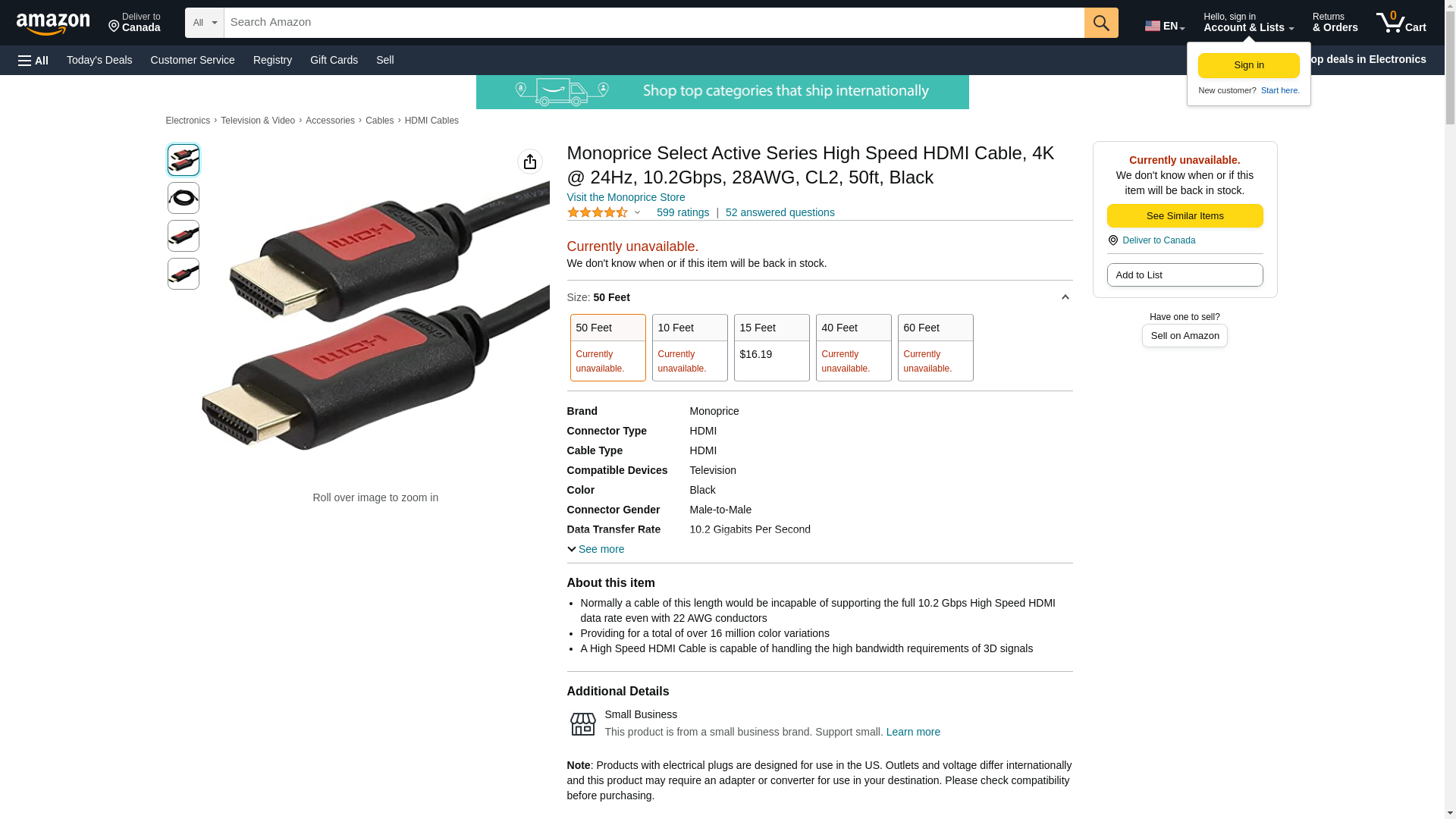 Monoprice Select Active Series High Speed HDMI Cable, 4K @ 24Hz, 10.2Gbps, 28AWG, CL2, 50ft, Black