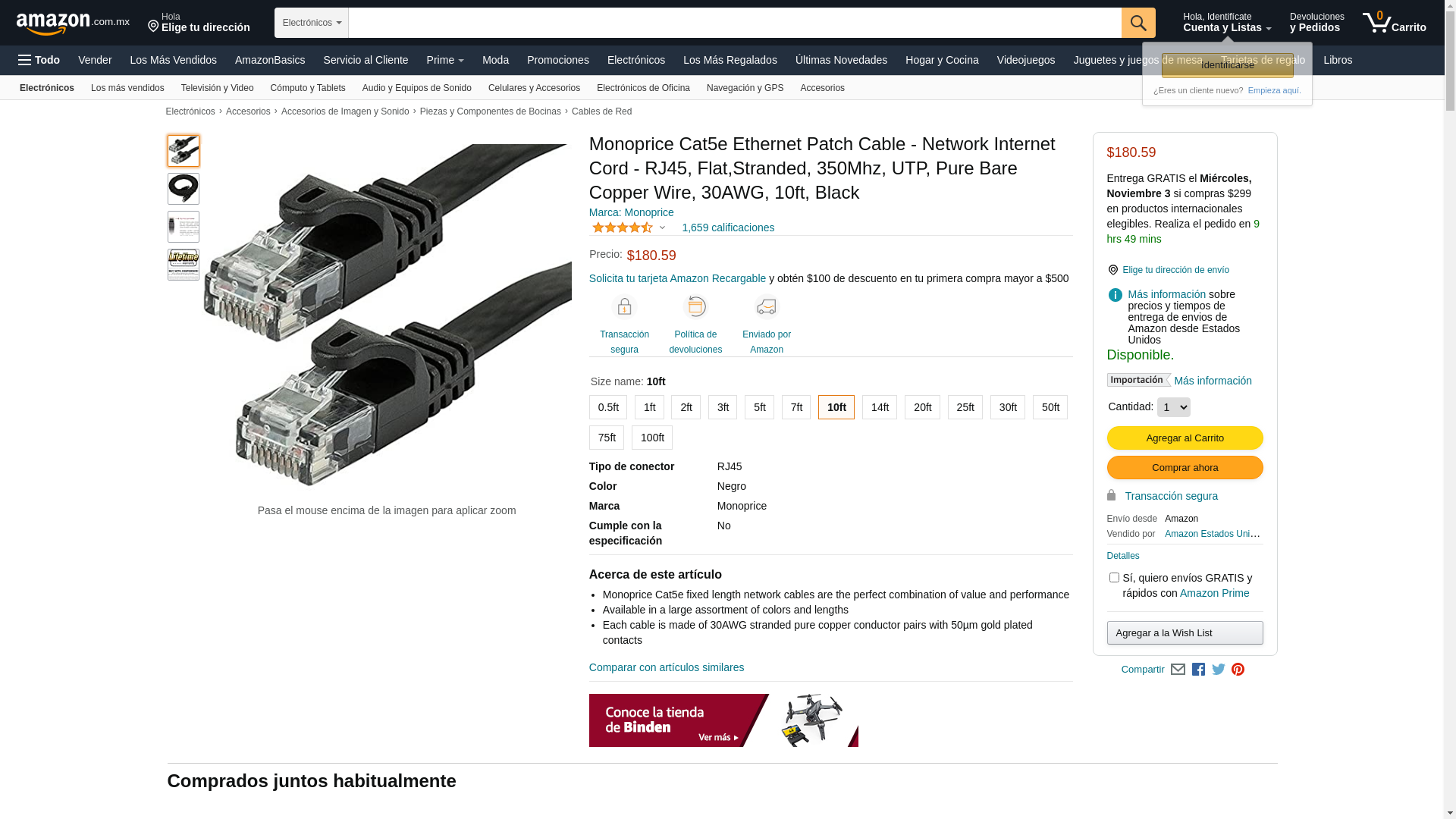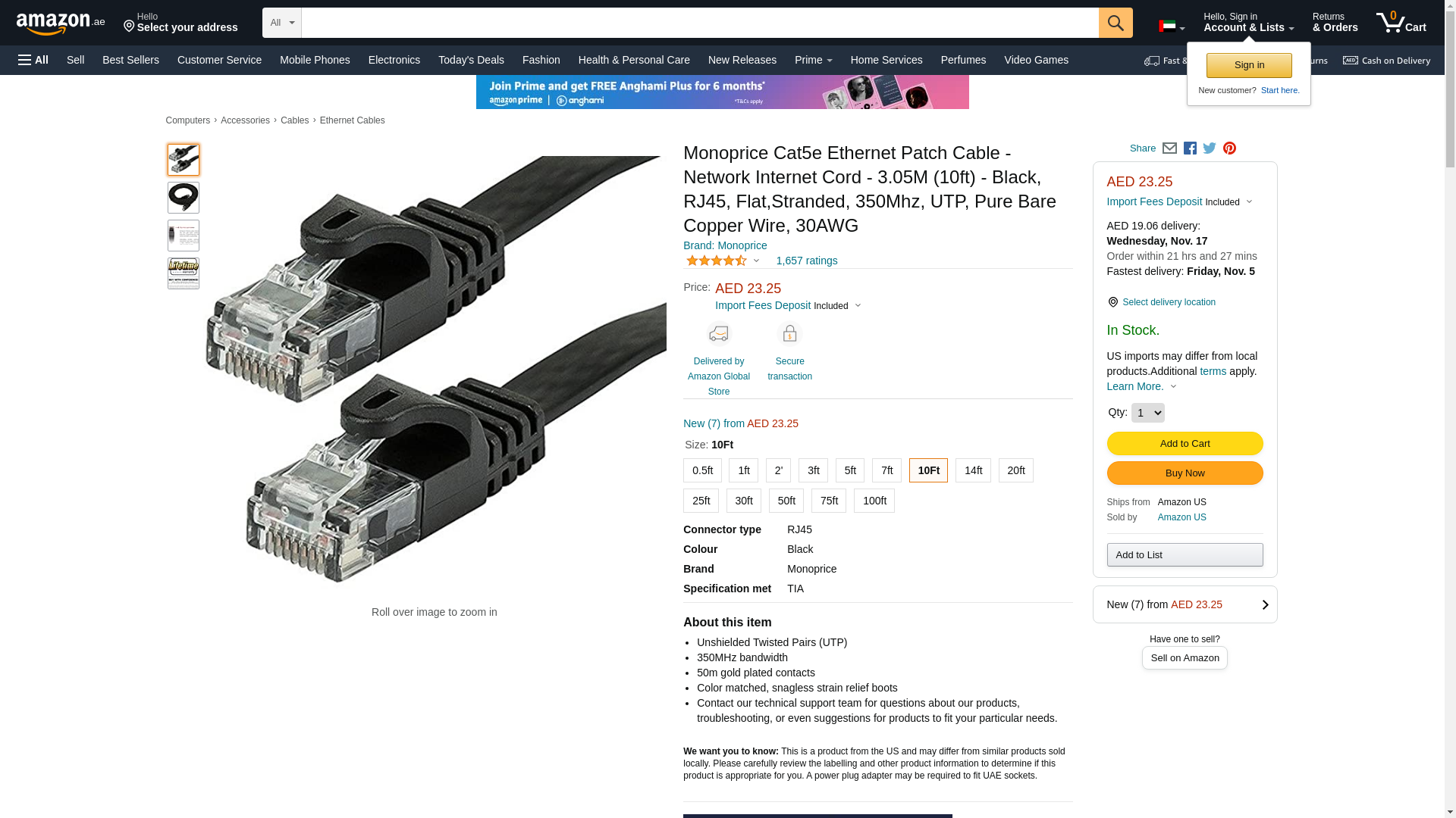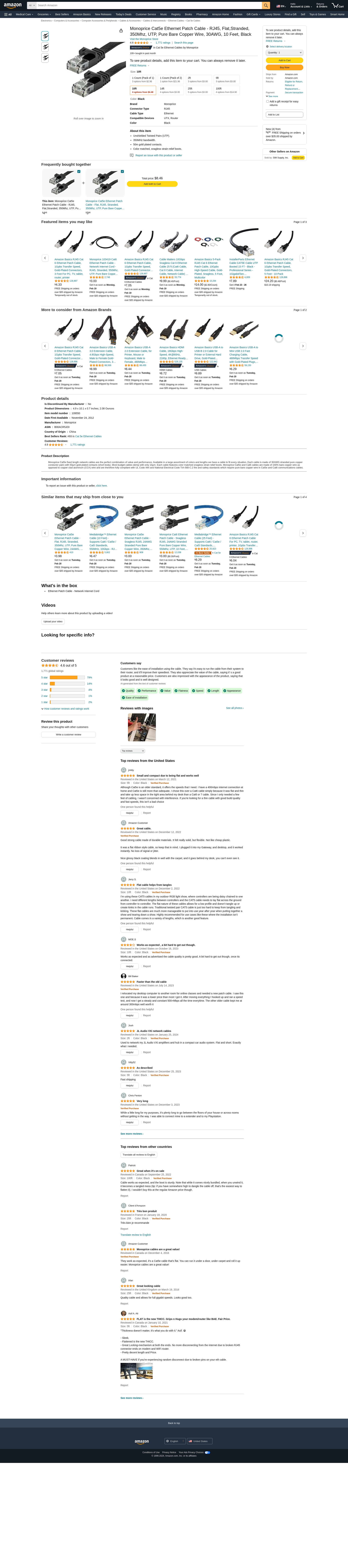 Monoprice Cat5e Ethernet Patch Cable - RJ45, Flat,Stranded, 350Mhz, UTP, Pure Bare Copper Wire, 30AWG, 10 Feet, Black