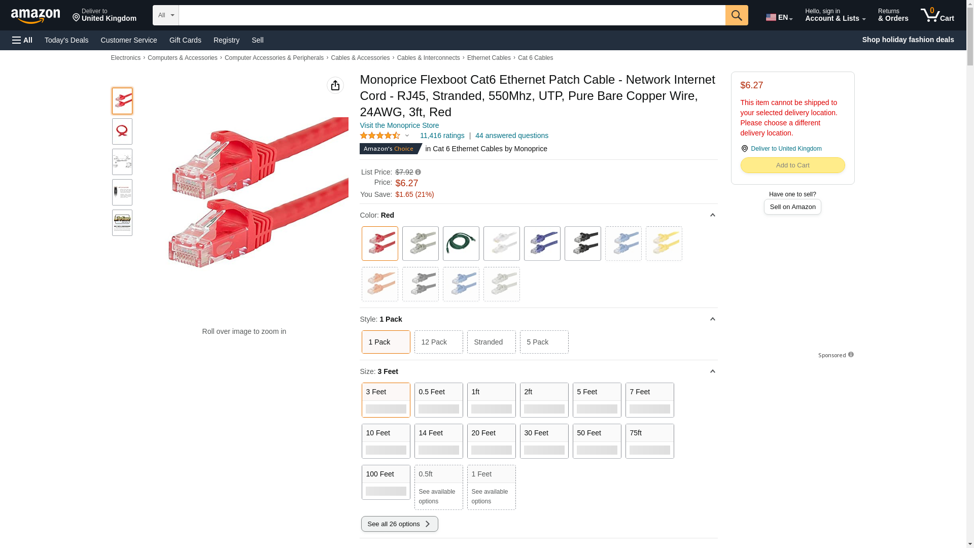 Monoprice Cat6 Ethernet Patch Cable - RJ45, Stranded, 550Mhz, UTP, Pure Bare Copper Wire, 24AWG, 3 Feet, Red - Flexboot Series