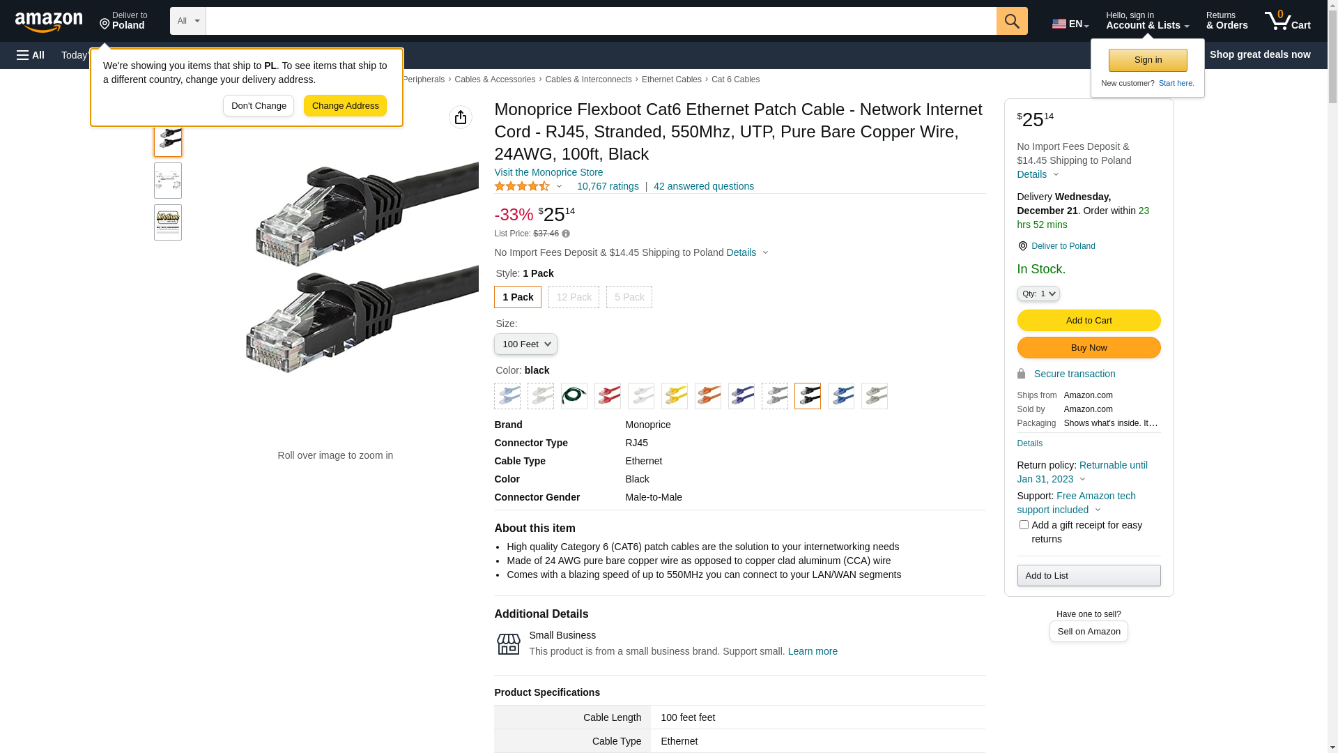 Monoprice Cat6 Ethernet Patch Cable - Snagless RJ45, 24AWG Stranded Pure Bare Copper Wire, 550Mhz, UTP, 100 Feet, Black - Flexboot Series