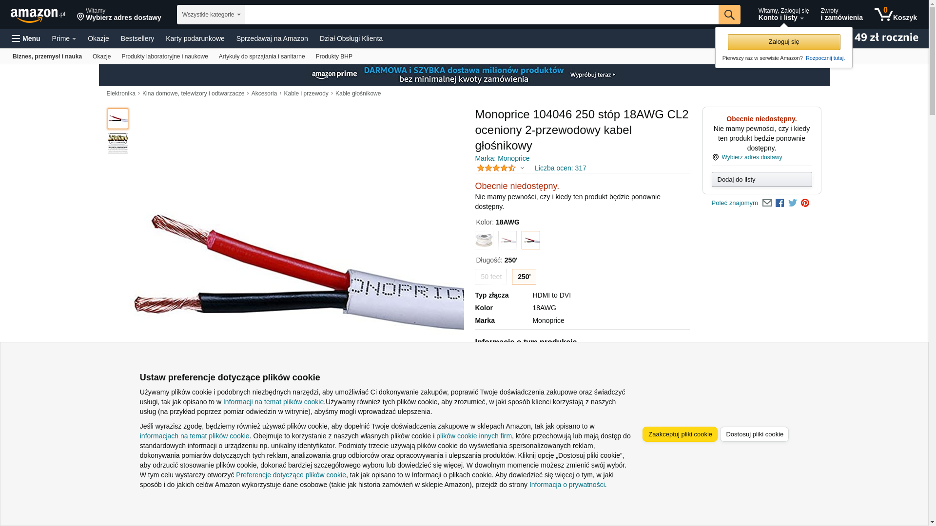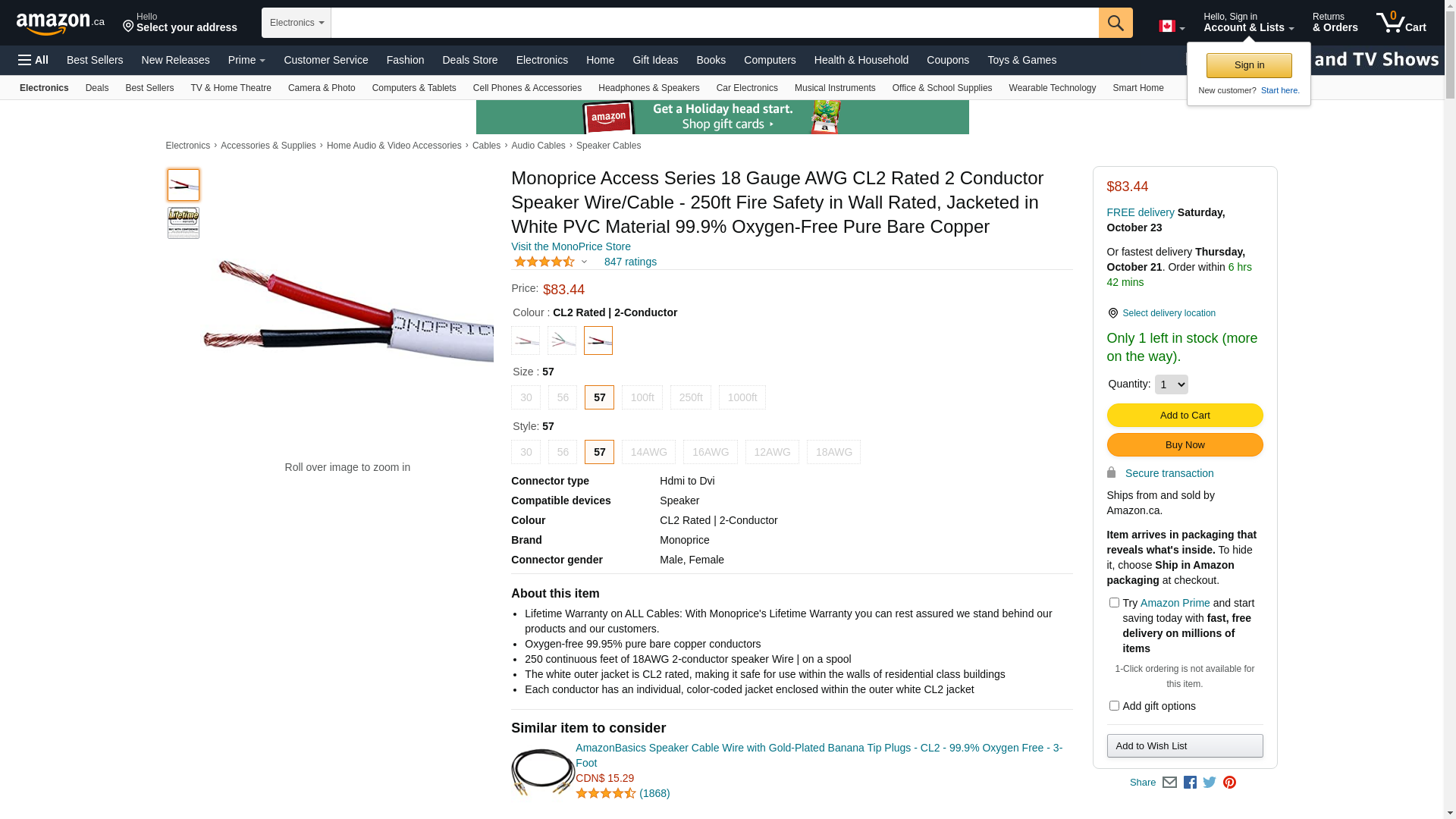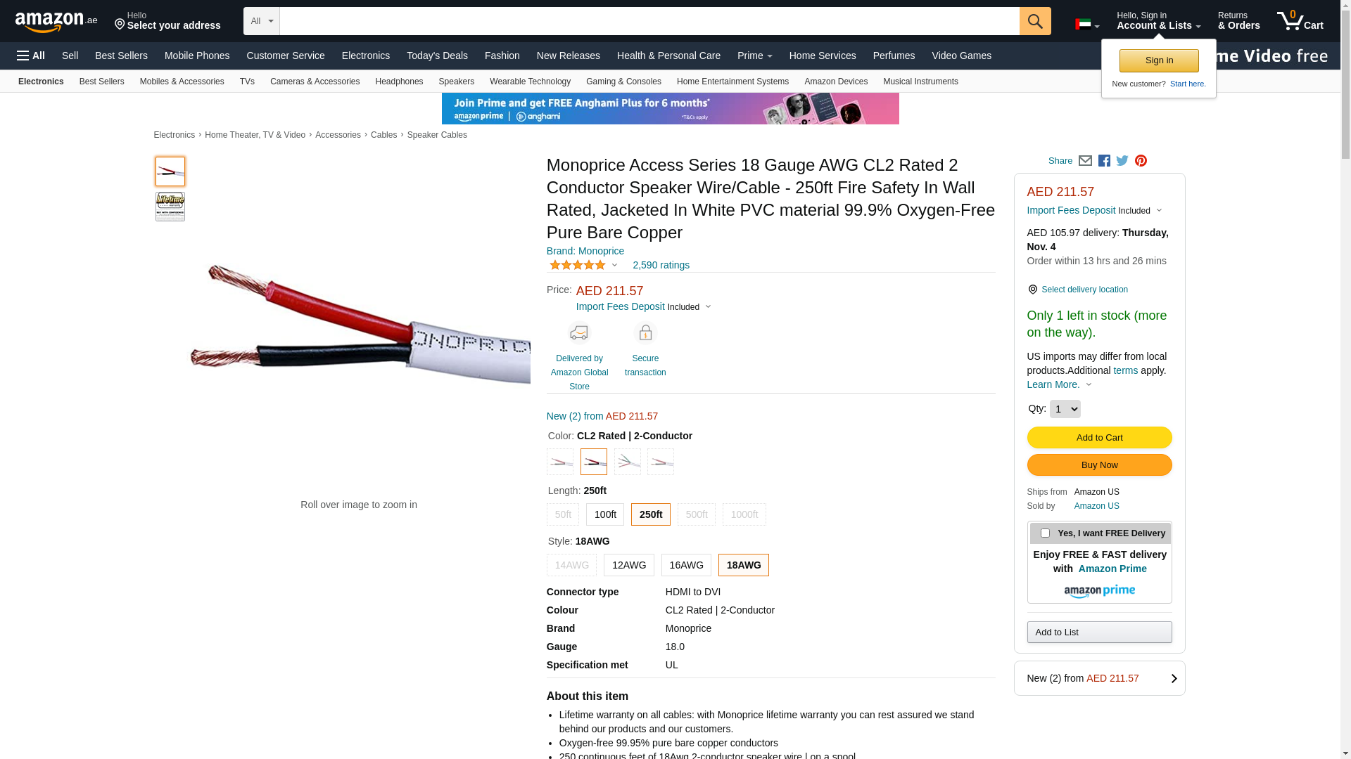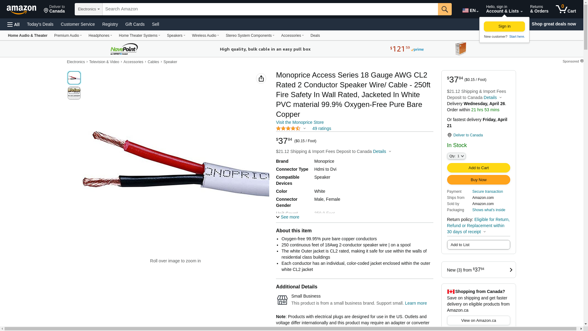 Monoprice Speaker Wire - CL2 Rated, 2-Conductor, 18AWG, PVC Jacket Material, 99.9% Oxygen-Free Pure Bare Copper, 250 Feet, White