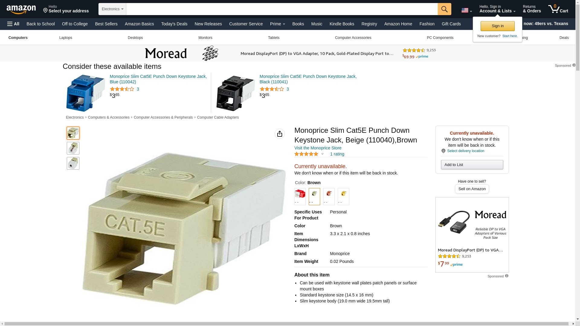 Monoprice Slim Cat5E Punch Down Keystone Jack, Beige (110040),Brown