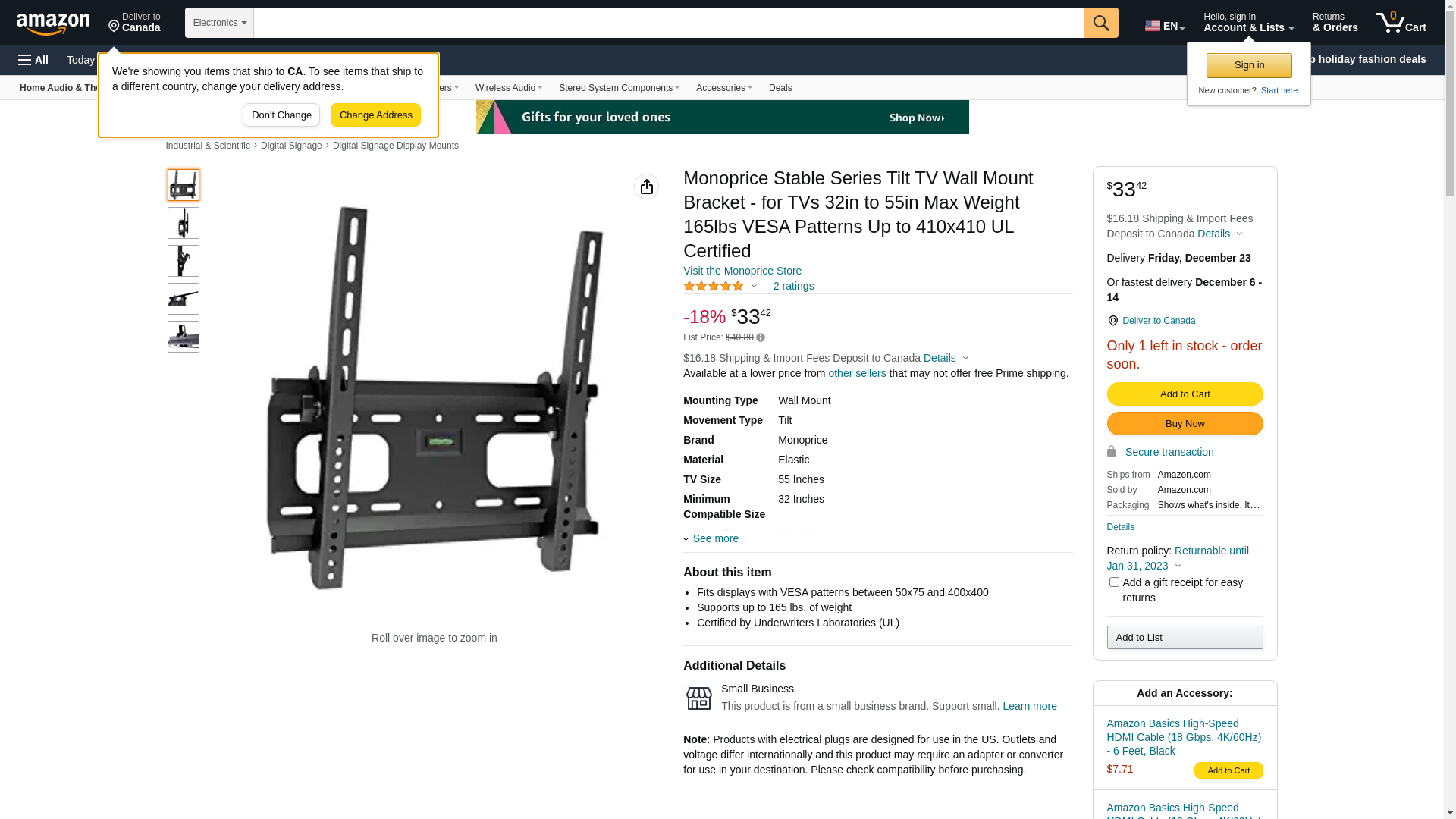 <ul> <li>Mount type: Tilt. Color: Black</li> <li>Supports displays 32 inches to 55 inches, and up to 165 lbs</li> <li>Supported VESA: 100x100 200x200 300x200 400x200 300x300 400x300 400x400</li> <li>Monoprice Lifetime Warranty on all TV Wall Mounts</li> <li>Mounting hardware included. UL Certified</li> </ul>