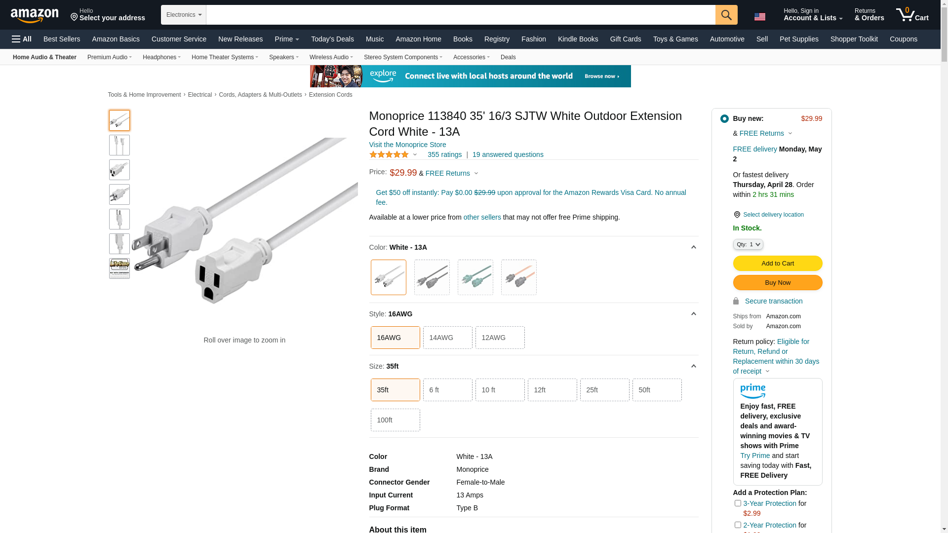 Monoprice 113840 35' 16/3 SJTW White Outdoor Extension Cord White - 13A