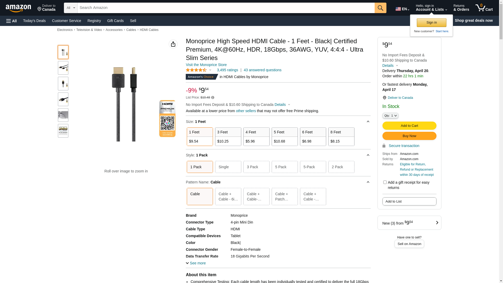 Monoprice High Speed HDMI Cable - 1 Feet - Black| Certified Premium, 4K@60Hz, HDR, 18Gbps, 36AWG, YUV, 4:4:4 - Ultra Slim Series: Maxedbuy.com