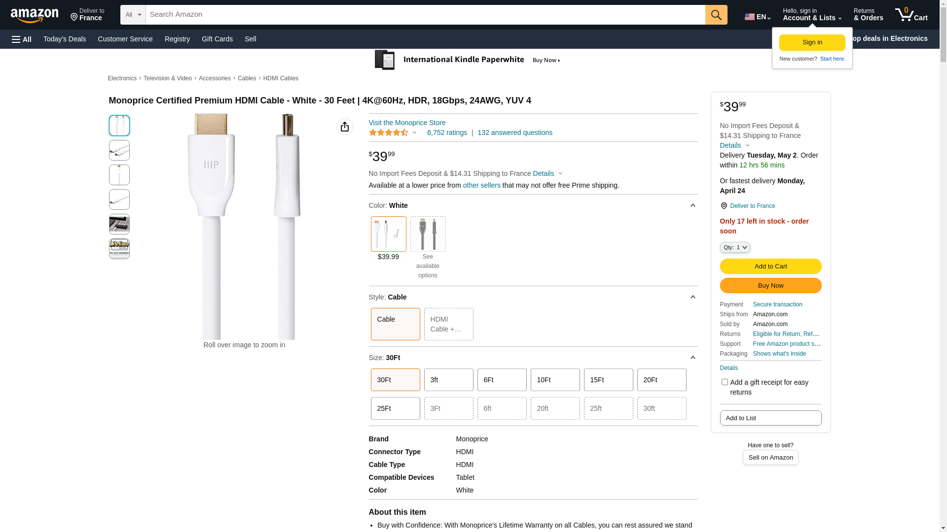 Monoprice Certified Premium HDMI Cable - White - 30 Feet | 4K@60Hz, HDR, 18Gbps, 24AWG, YUV 4