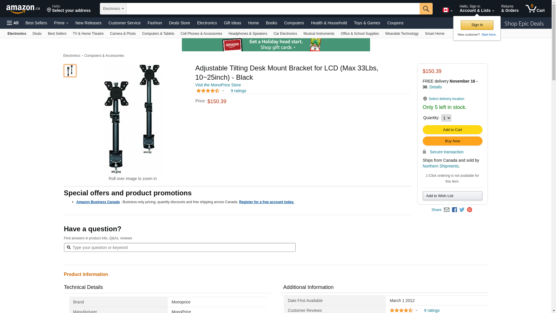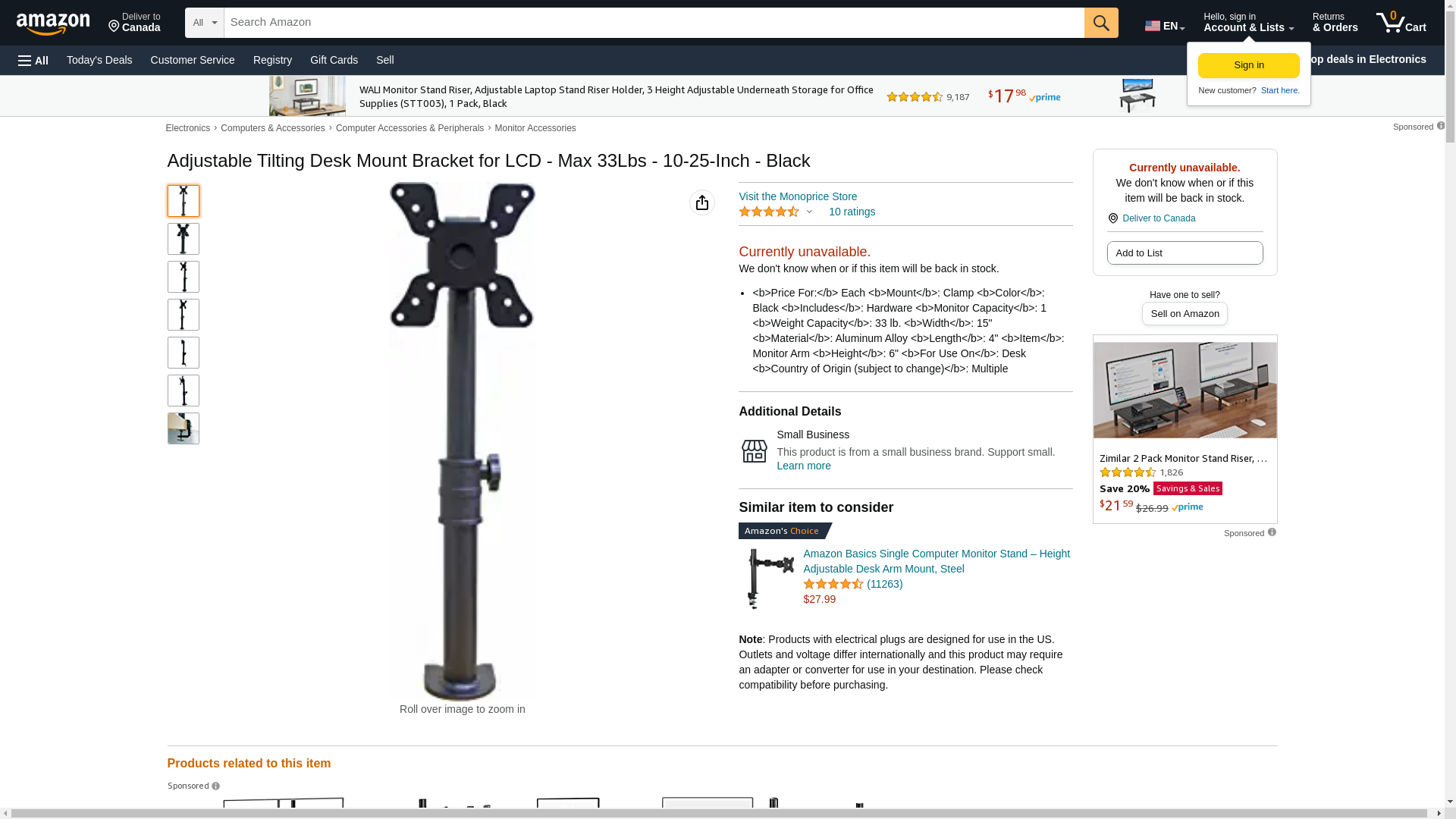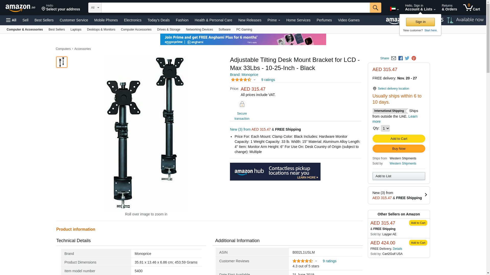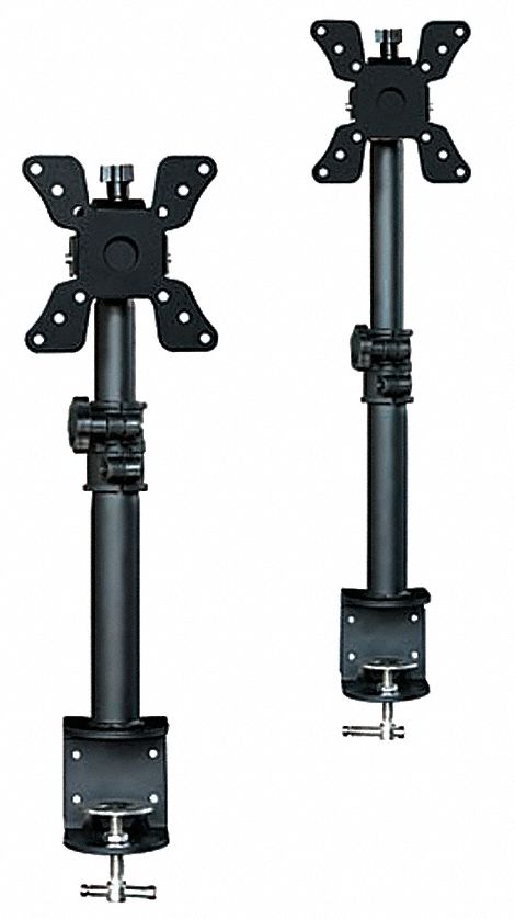 - <b>Price For:</b> Each <b>Mount</b>: Clamp <b>Color</b>: Black <b>Includes</b>: Hardware <b>Monitor Capacity</b>: 1 <b>Weight Capacity</b>: 33 lb. <b>Width</b>: 15" <b>Material</b>: Aluminum Alloy <b>Length</b>: 4" <b>Item</b>: Monitor Arm <b>Height</b>: 6" <b>For Use On</b>: Desk <b>Country of Origin (subject to change)</b>: Multiple