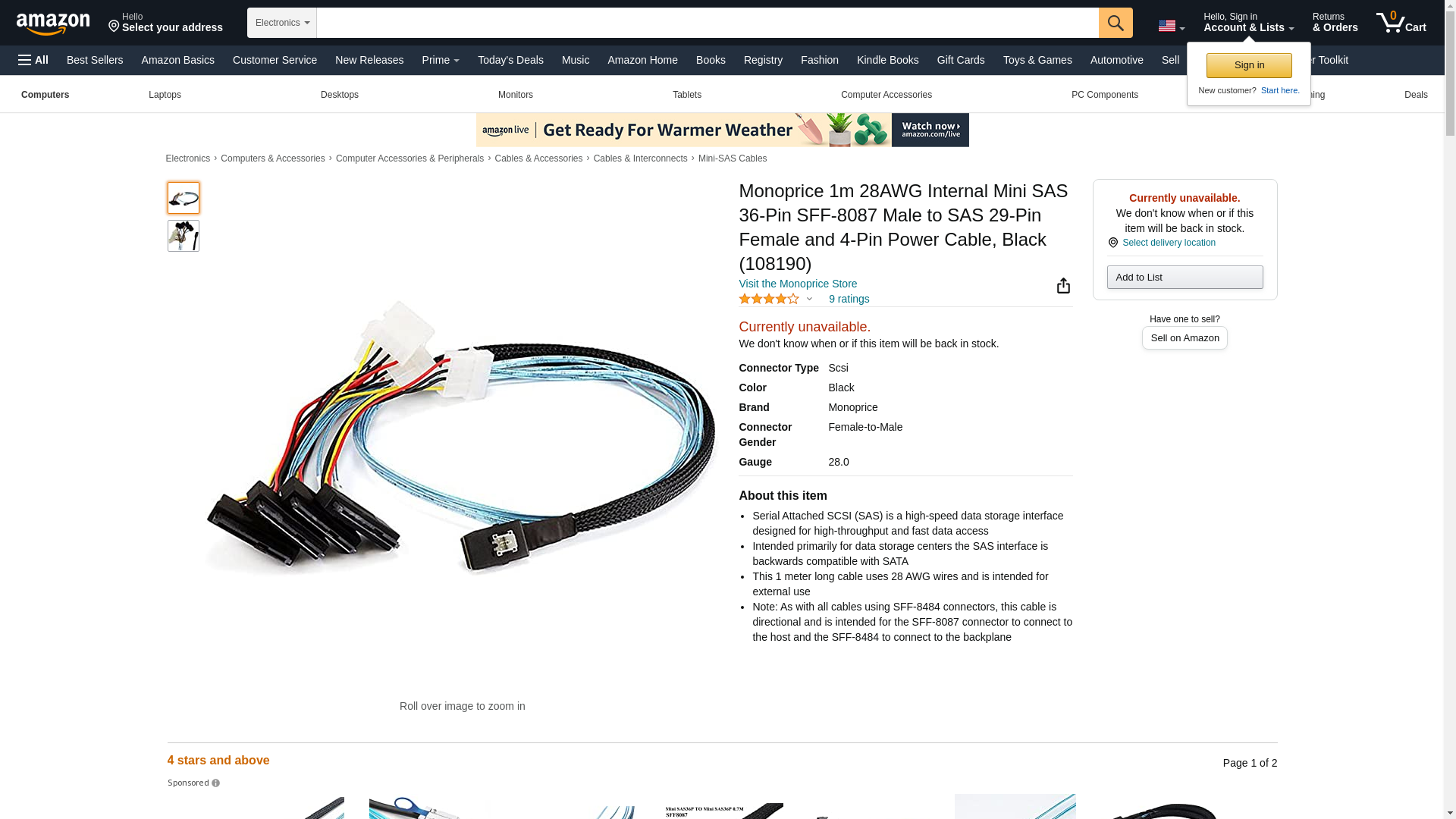 MonoPrice 8190 1m 28AWG Internal Mini SAS 36pin Male to SAS