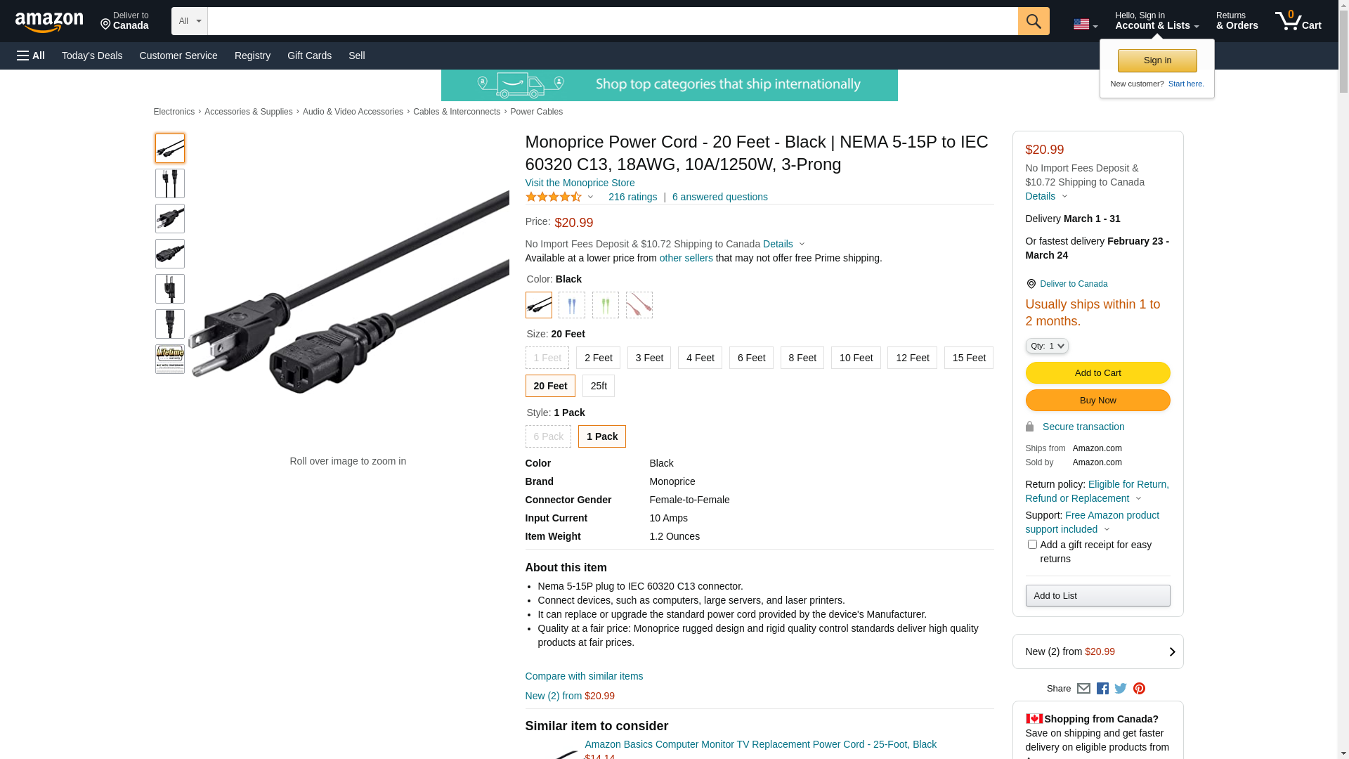 Monoprice Power Cord - NEMA 5-15P to IEC 60320 C13, 10 Amp, 1250 Watt, 3-Prong, 18AWG, 20 Feet, Black