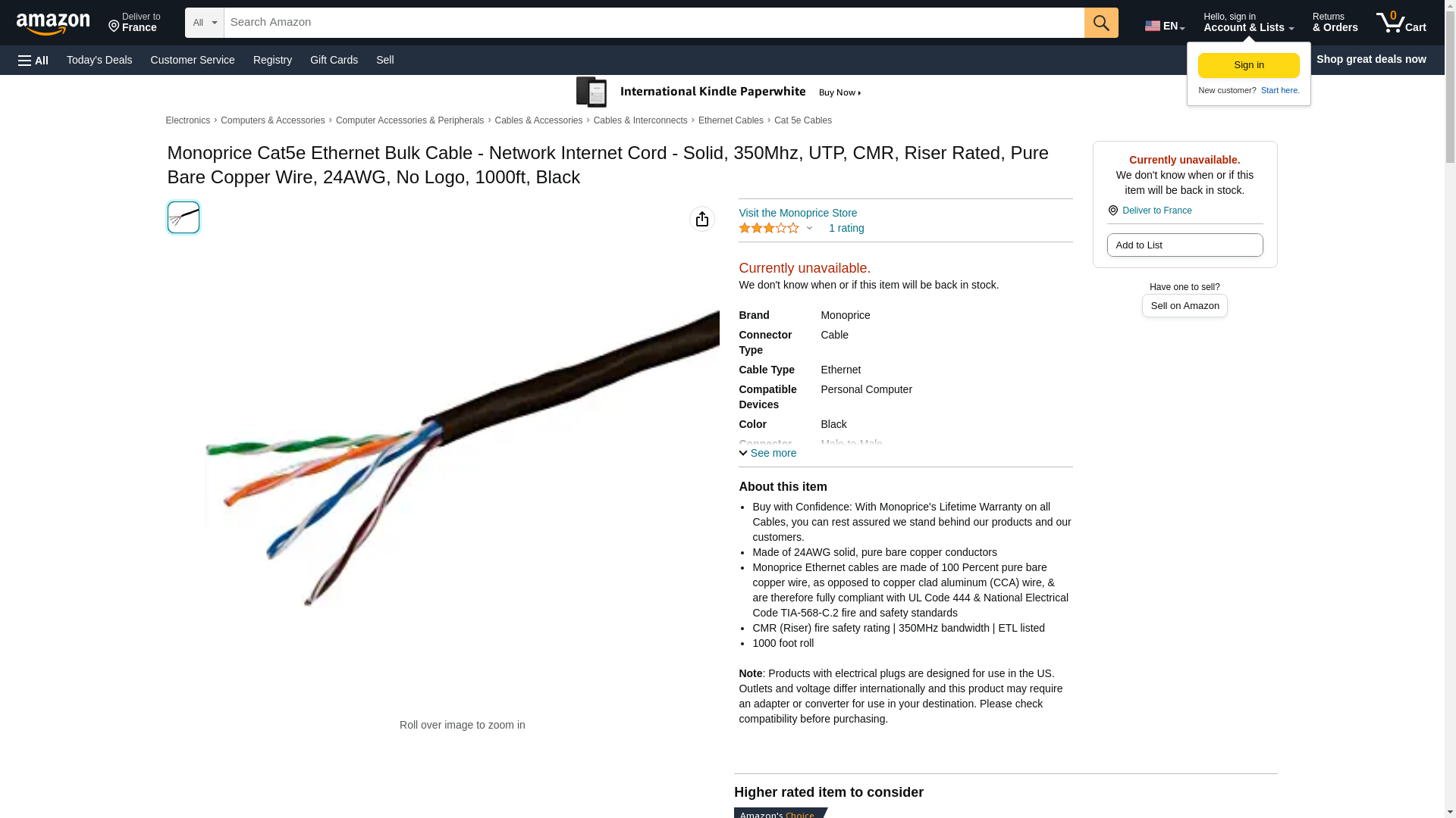 | Feature | 1000FT Cat5e Bulk Bare Copper Ethernet Cable-UTP-Solid-Riser Rated (CMR)-24AWG-Black |