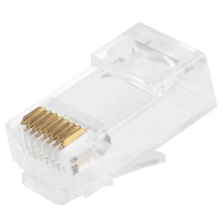 Modular Plug with Insert, Connector Type RJ45, Color Clear, Features Gold-Plated Contacts, Product Type Modular Plug, Compatible Number of Fibers Duplex, Number of Contacts 8, Number of Positions 8, Compatible Wire Solid/Stranded Solid, Compatible Cable Performance Category 6, Includes Insert, Package Quantity 100