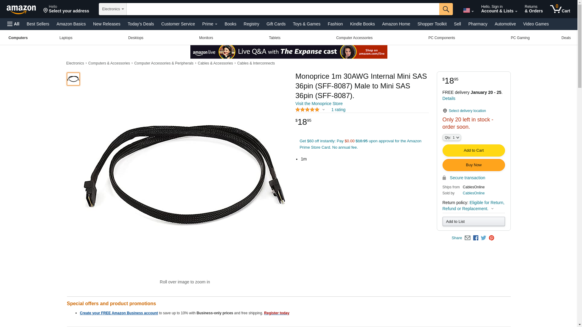 Monoprice 1m 30AWG Internal Mini SAS 36pin (SFF-8087) Male to Mini SAS 36pin (SFF-8087).