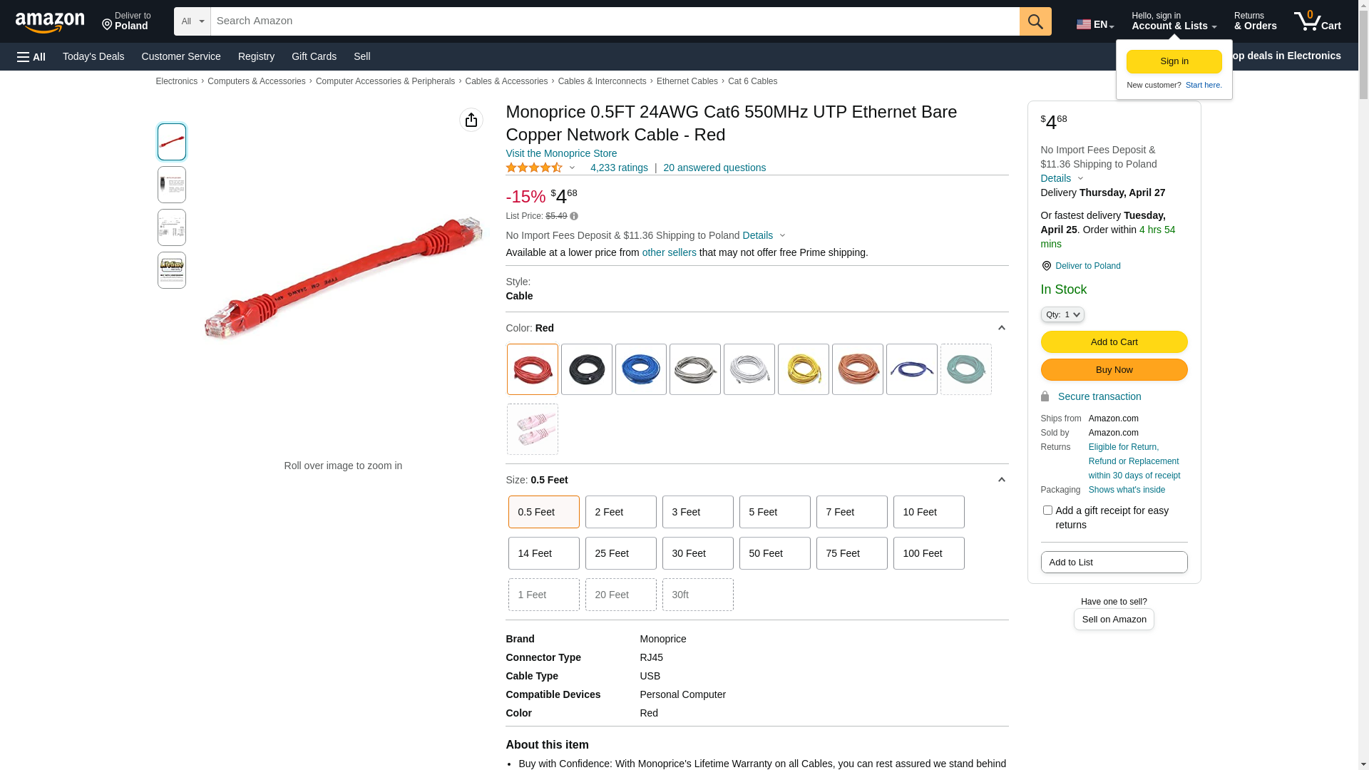 Monoprice 0.5FT 24AWG Cat6 550MHz UTP Ethernet Bare Copper Network Cable - Red. High quality Category 6 (CAT6) patch ...