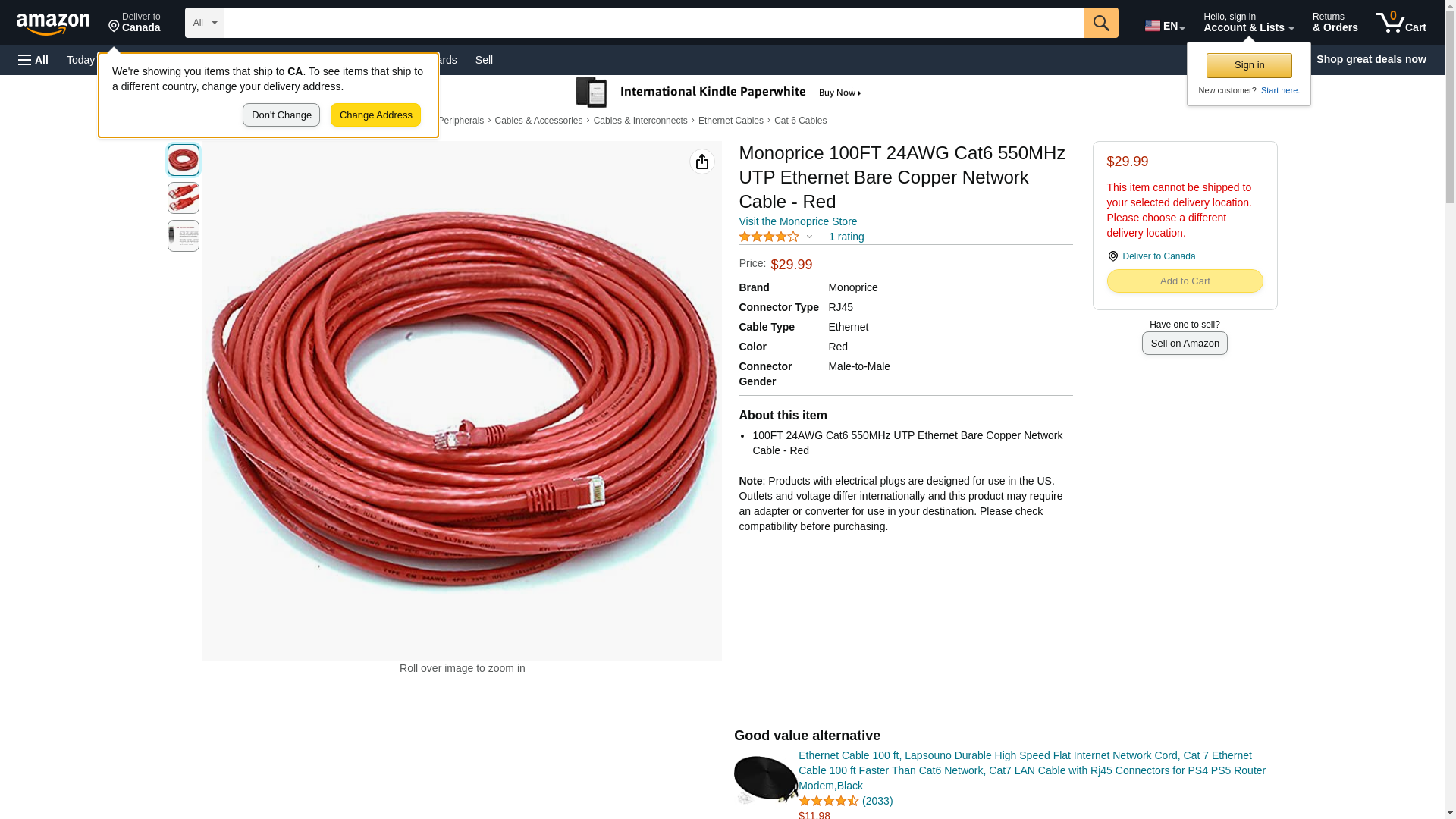 Monoprice 100FT 24AWG Cat6 550MHz UTP Ethernet Bare Copper Network Cable - Red