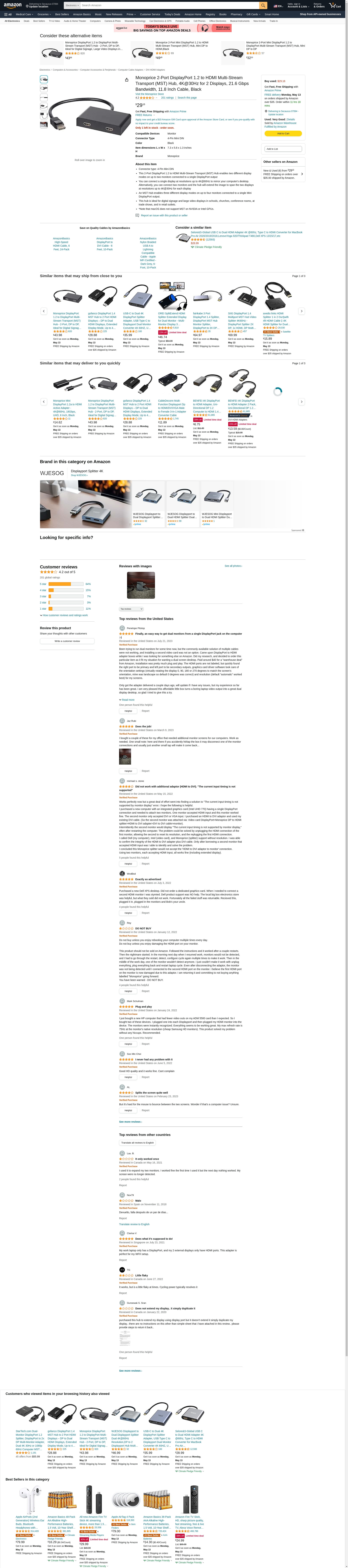 Monoprice 2-Port DisplayPort 1.2 to HDMI Multi-Stream Transport (MST) Hub, 4K@30Hz for 2 Displays, 21.6 Gbps Bandwidth, 11.8 Inch Cable, Black