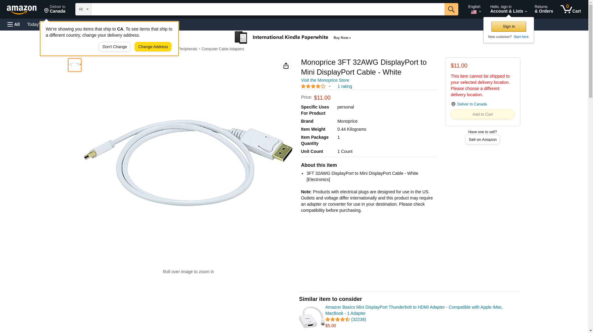 | Feature | 3FT 32AWG DisplayPort to Mini DisplayPort Cable - White [Electronics] |