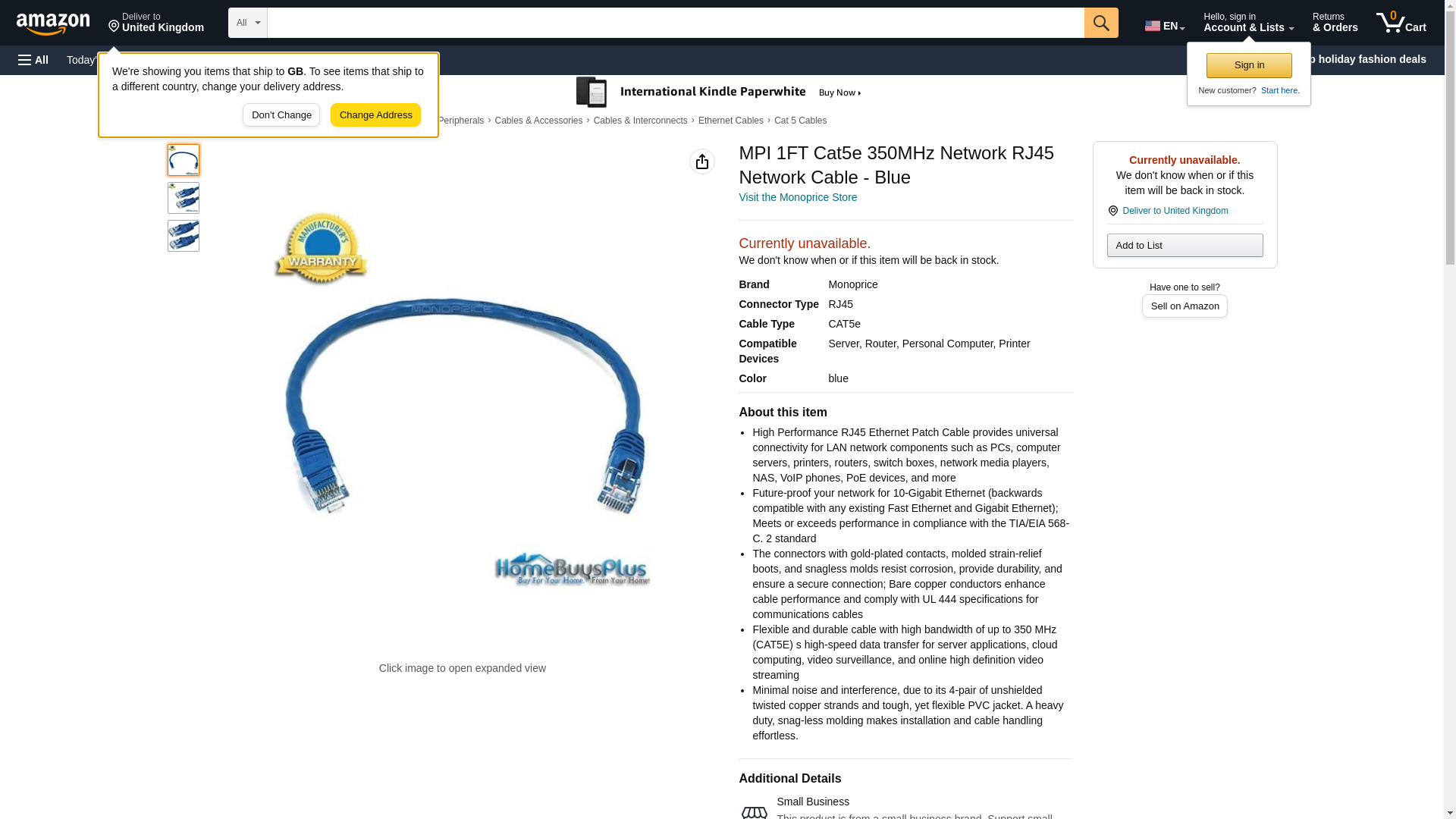 MPI 1FT Cat5e 350MHz Network RJ45 Network Cable - Blue