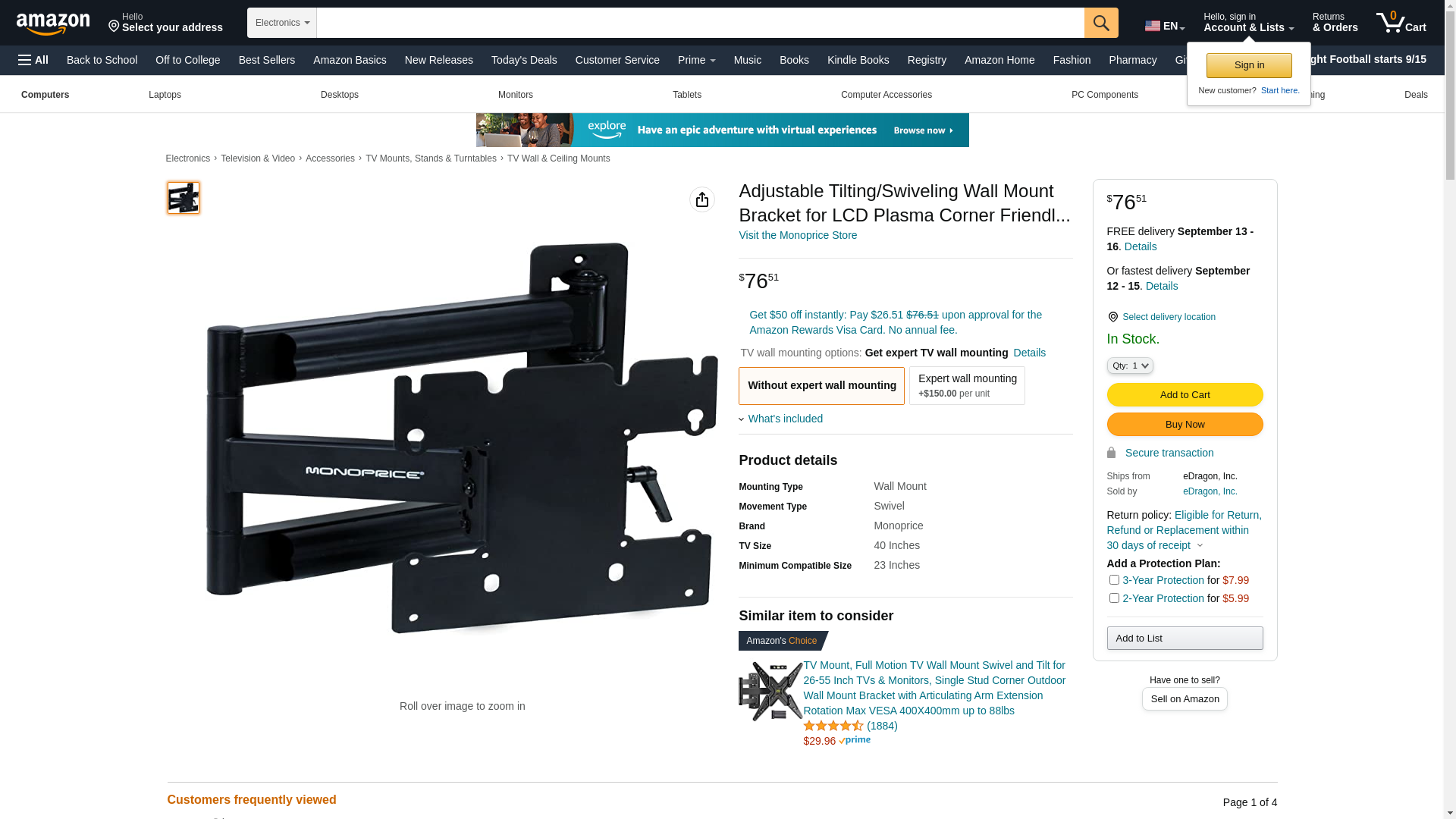 Adjustable Tilting/Swiveling Wall Mount Bracket for LCD Plasma Corner Friendl...