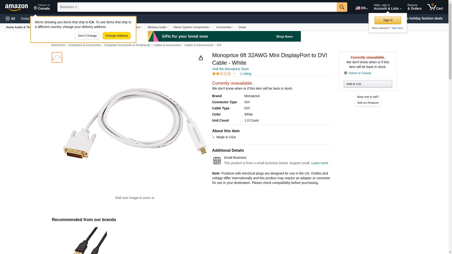 Monoprice 6ft 32AWG Mini DisplayPort to DVI Cable - White