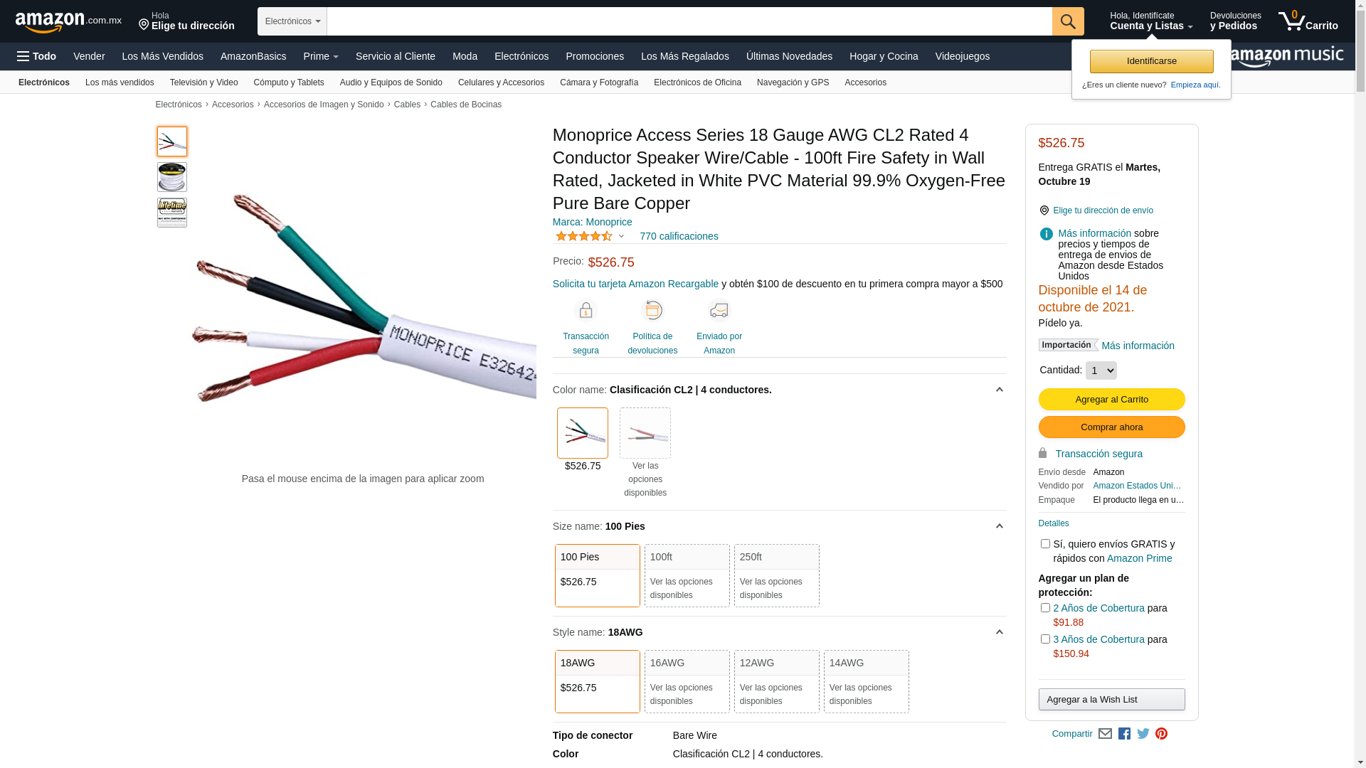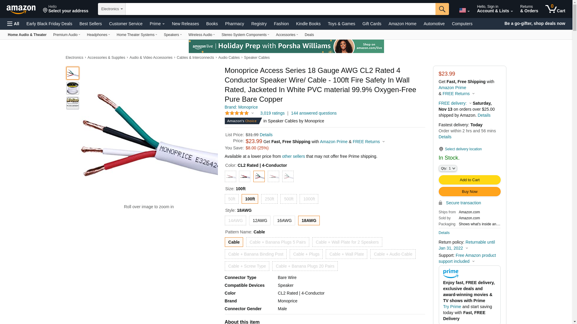 Monoprice 100-Feet 18AWG CL2 Rated 4-Conductor High-Purity Oxygen-Free Copper Speaker Wire. Greater than 99.95% pure,...