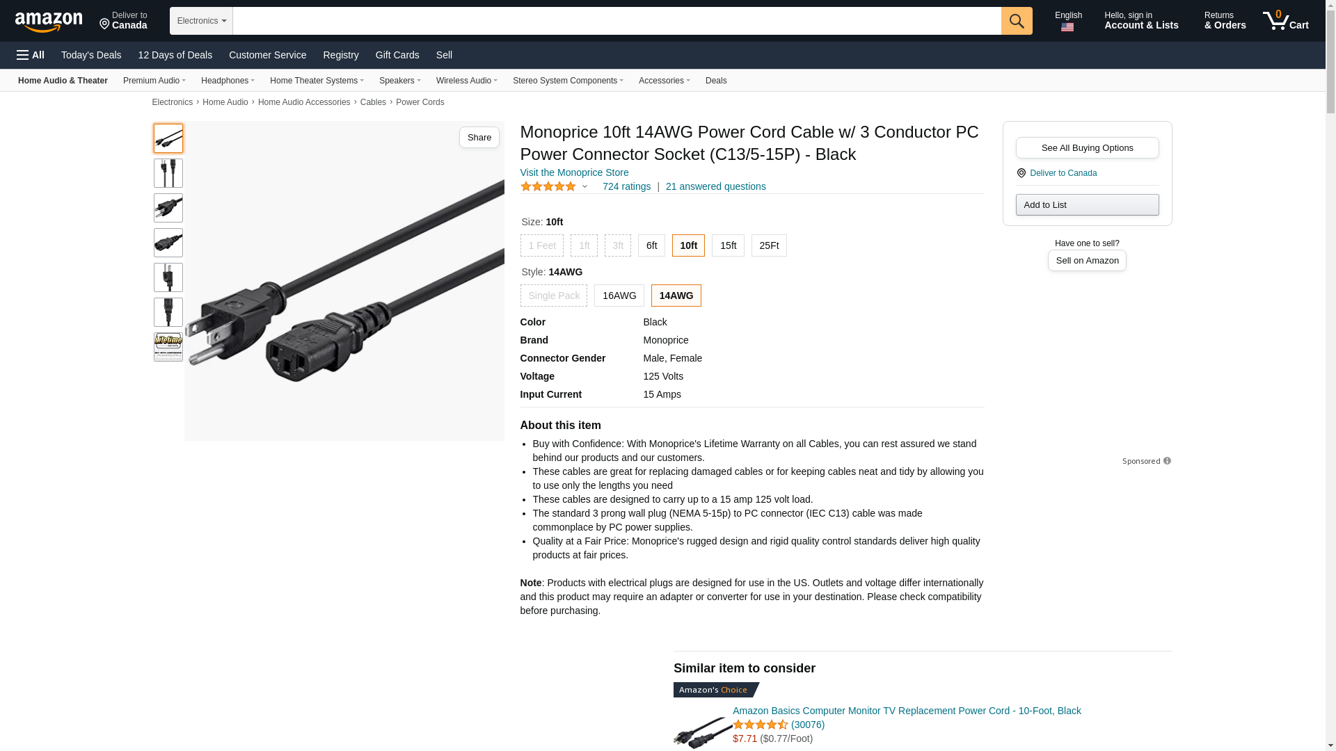 Monoprice 10ft 14AWG Power Cord Cable w/ 3 Conductor PC Power Connector Socket (C13/5-15P) - Black