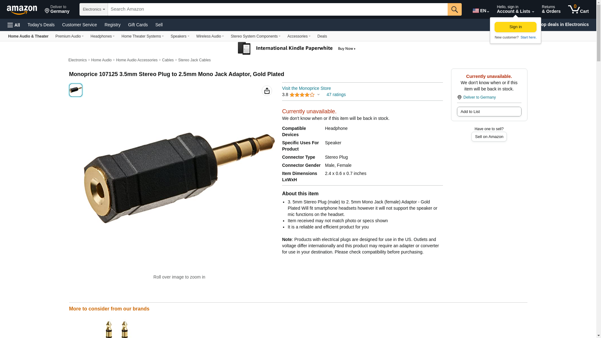 | Feature | 3. 5mm Stereo Plug (male) to 2. 5mm Mono Jack (female) Adaptor - Gold Plated Will fit smartphone headsets however it will not support the speaker or mic functions on the headset. |