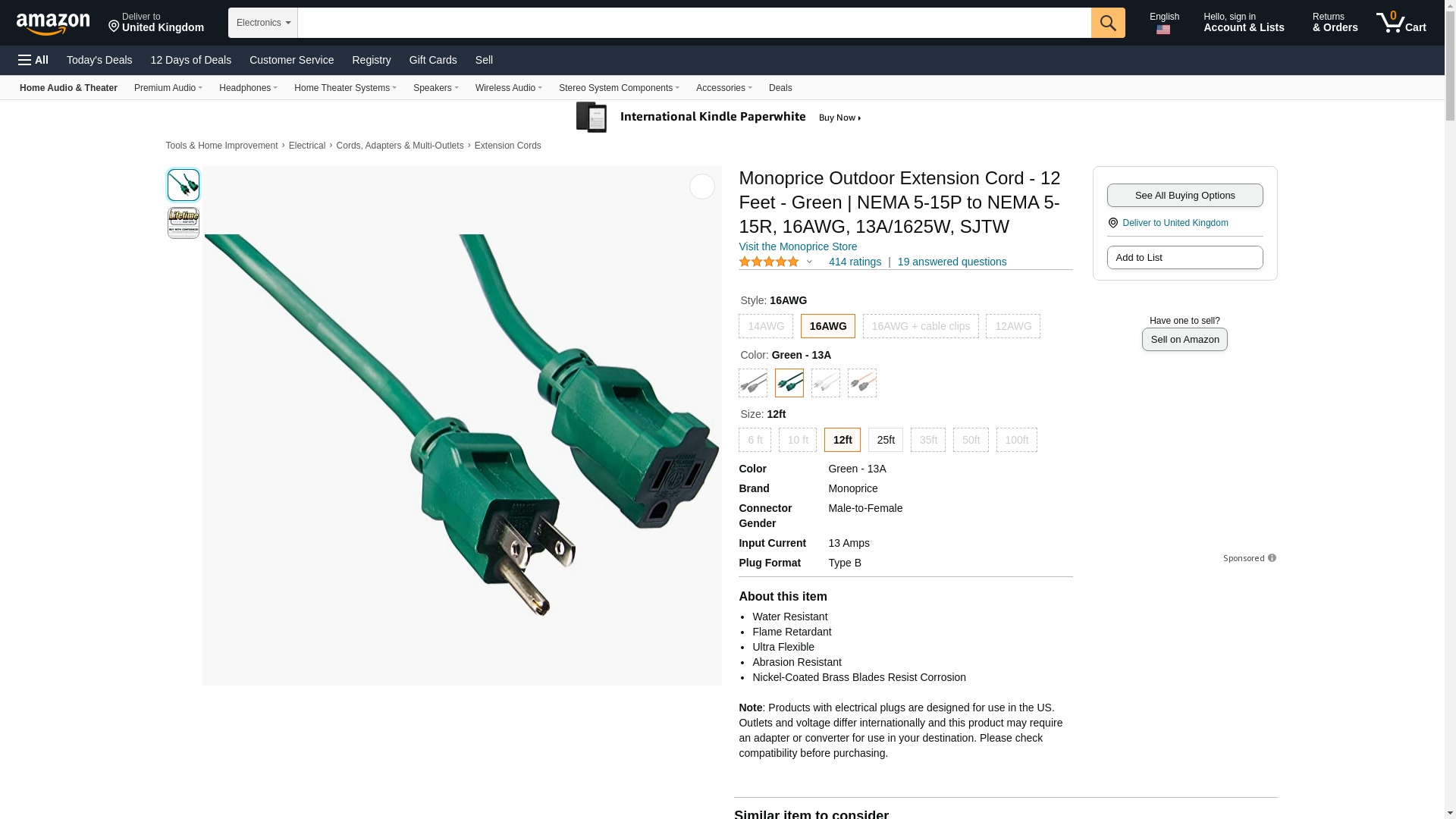 MONOPRICE, INC. 13833 12FT 16AWG GREEN OUTDOOR POWER EXTENSION CORD CABLE, 13A (NEMA 5-15P TO NEMA 5-1