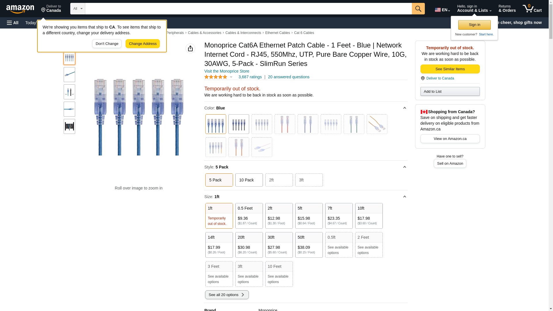Monoprice Cat6A Ethernet Patch Cable - Snagless RJ45, 550Mhz, 10G, UTP, Pure Bare Copper Wire, 30AWG, 5-Pack, 1 Feet, Blue - SlimRun Series