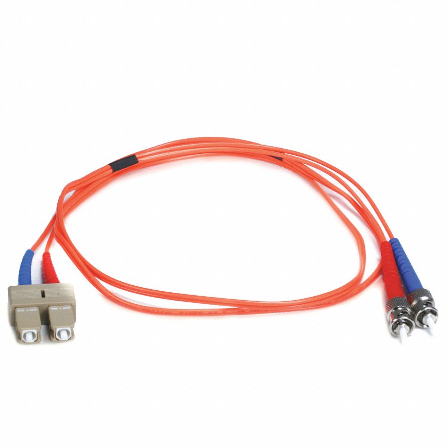 Fiber Optic Patch Cord, Mode Multi-Mode, End 1 Connection Type SC, End 2 Connection Type ST, Jacket Color Orange, Overall Length 1 m, Jacket Material PVC, Cable Diameter 2 mm, Clad Dimension 125 micron, Core Diameter 62.5 micron, Fiber Count 2, Number of Fibers Duplex, Fire Rating Riser, Attenuation Less Than or Equal To 0.30 dB, Bandwidth 10 GBps, NEC Article and Type OFNR, Standards UL Listed
