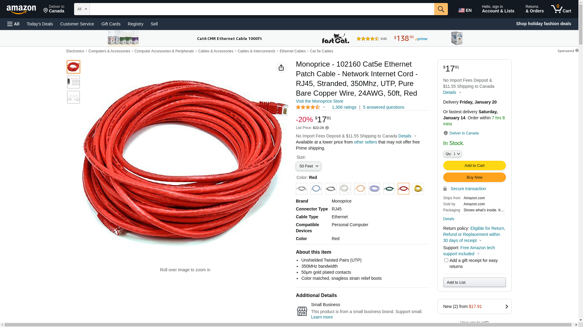 Monoprice 50 Feet 24AWG Cat5e 350MHz UTP Bare Copper Ethernet Network Cable, Red (2 Pack)