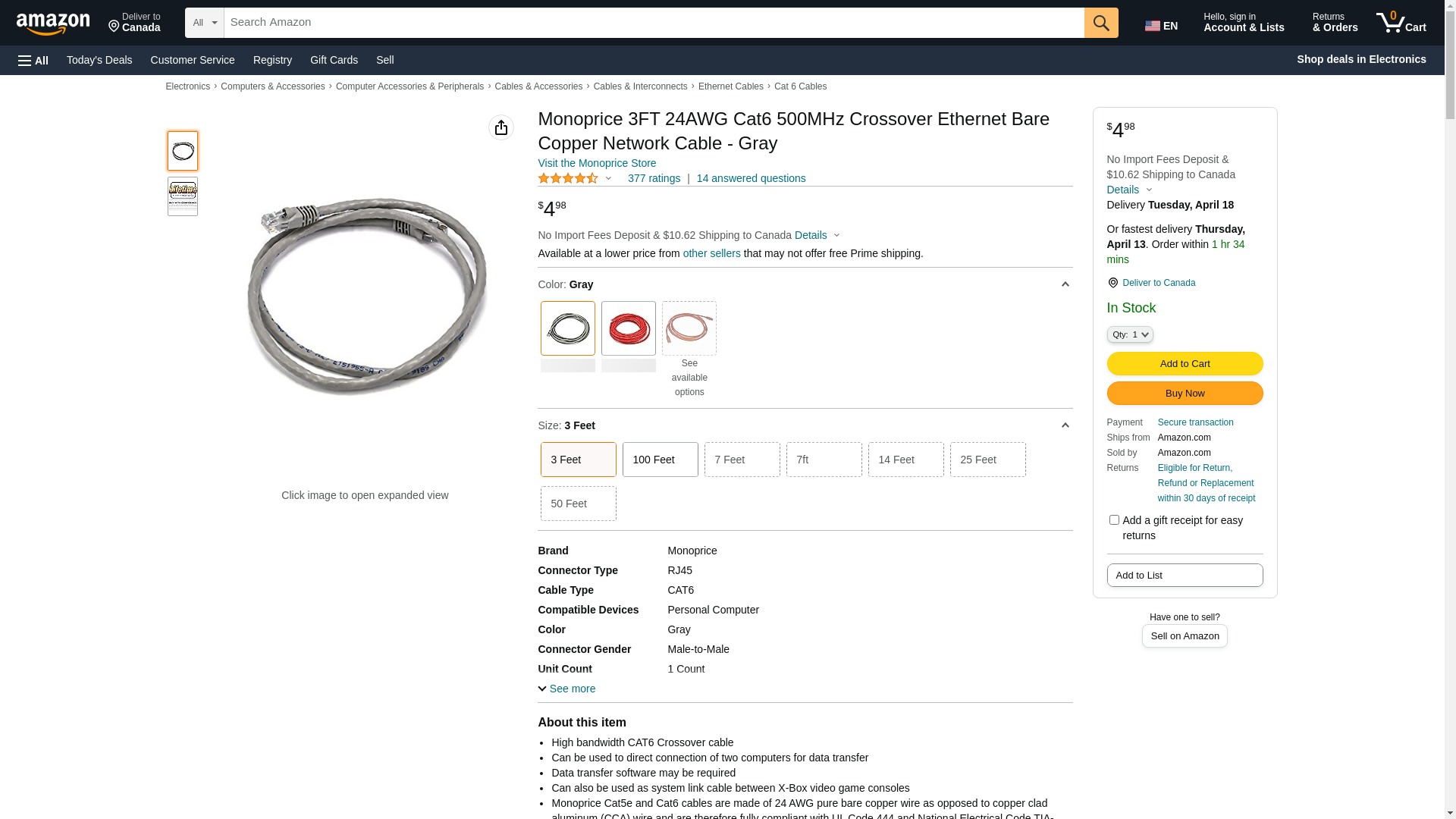 Monoprice 7-Feet 24AWG Cat6 500MHz Crossover Ethernet Bare Copper Network Cable, Gray (102378). High bandwidth CAT6 C...