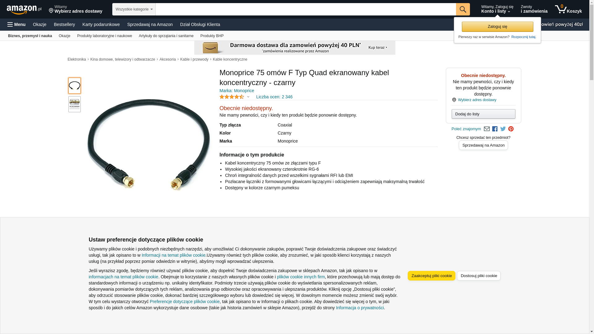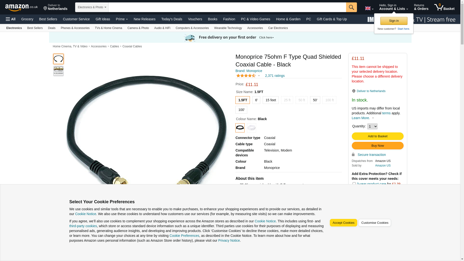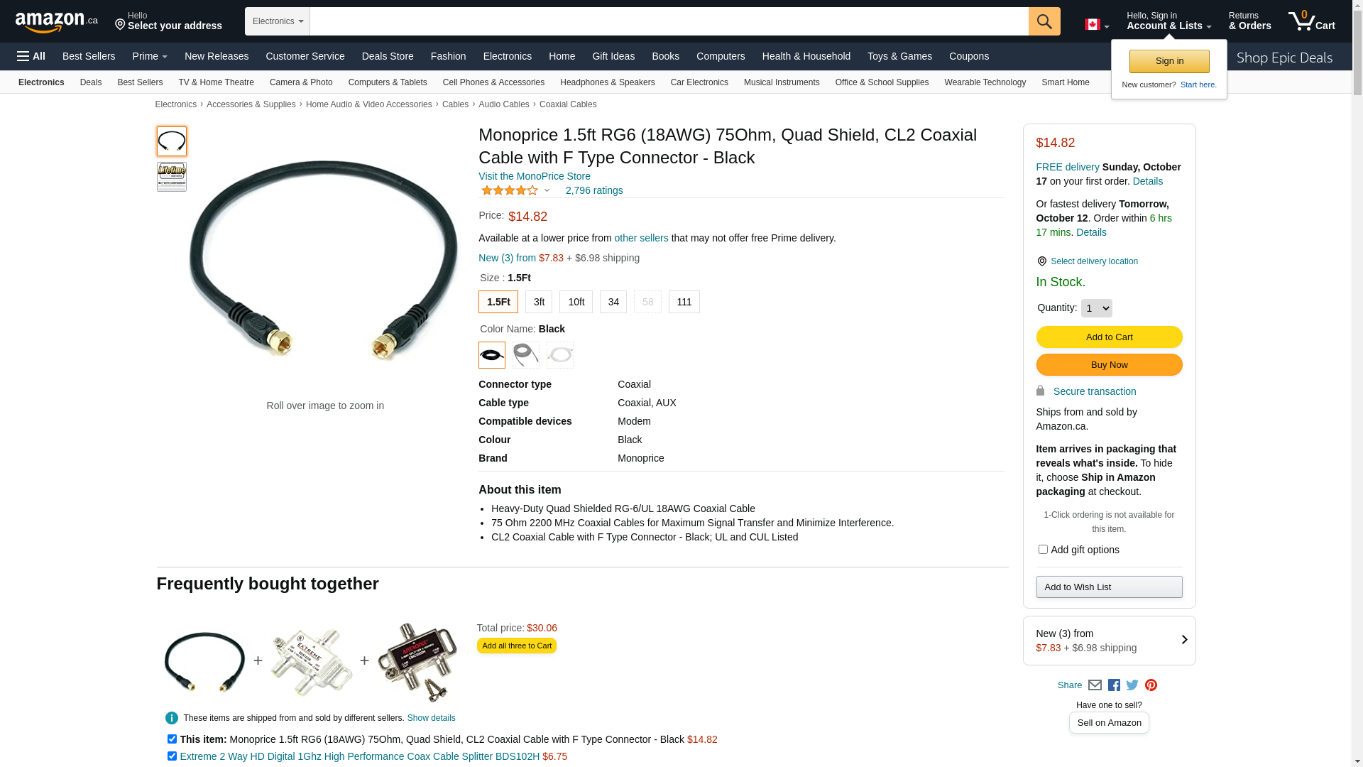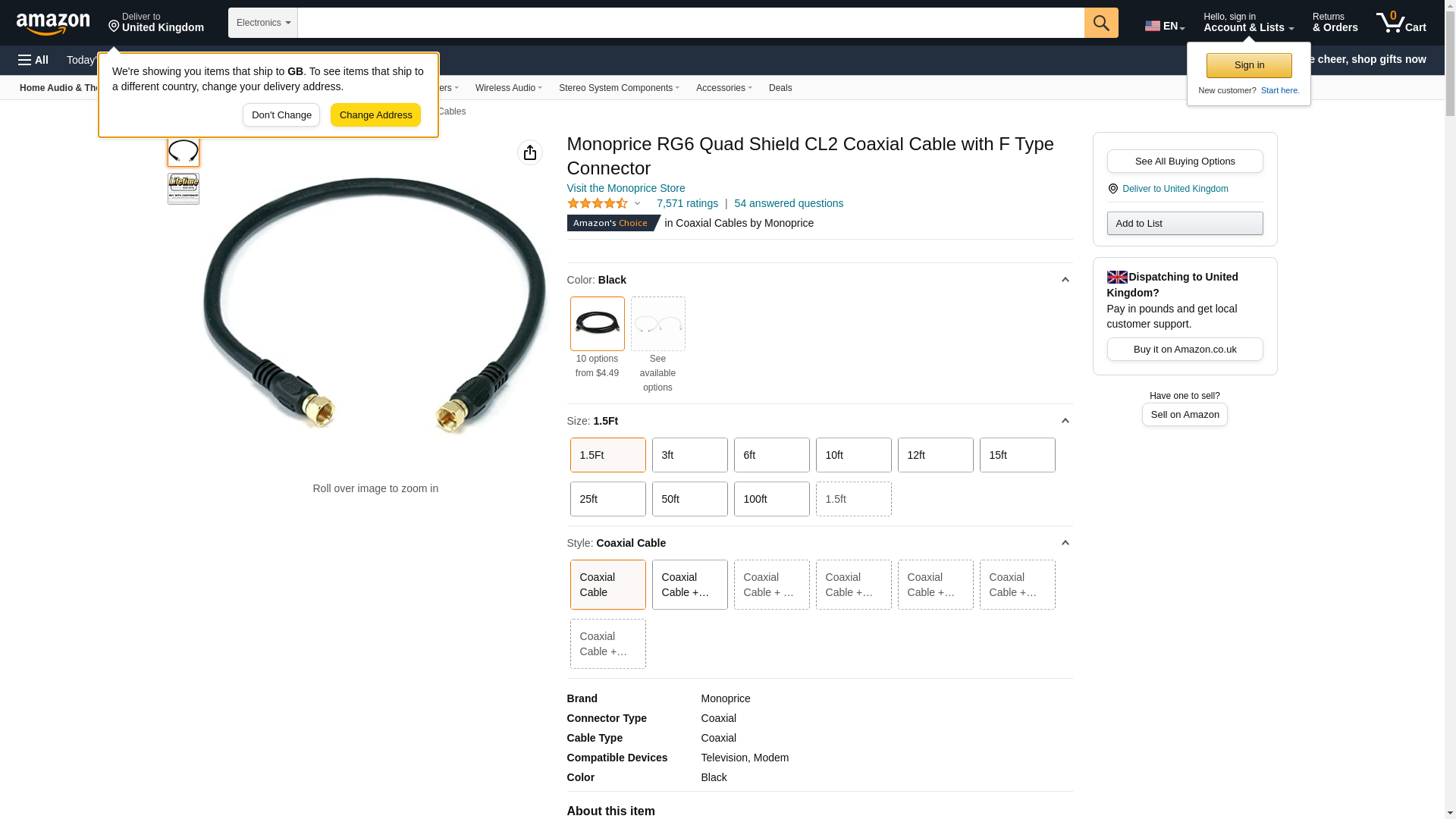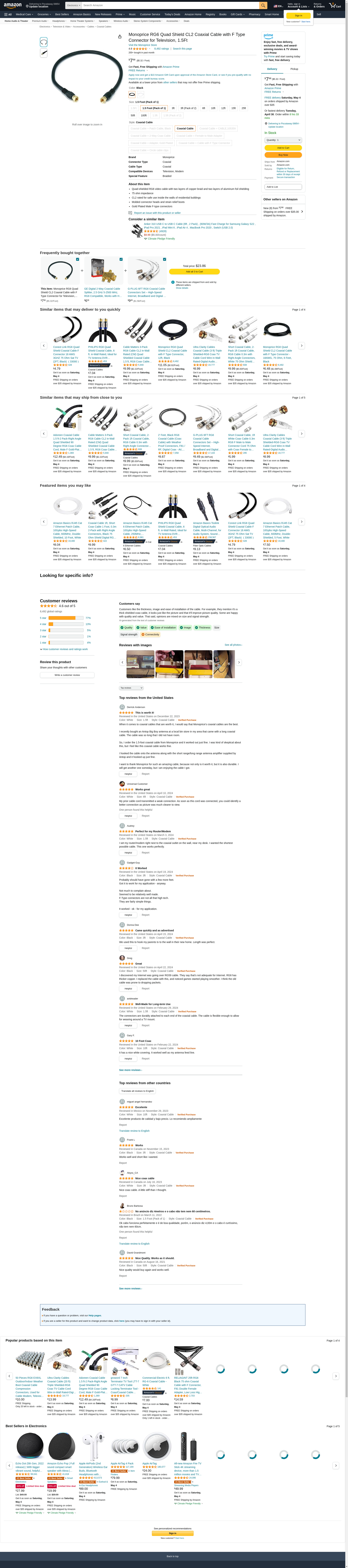 Monoprice 45.7cm RG6/18AWG 75 ohm Quad Shielded CL2 F-Type Coaxial RF Cable, Black. Quad-shielded RG6 video cable wit...
