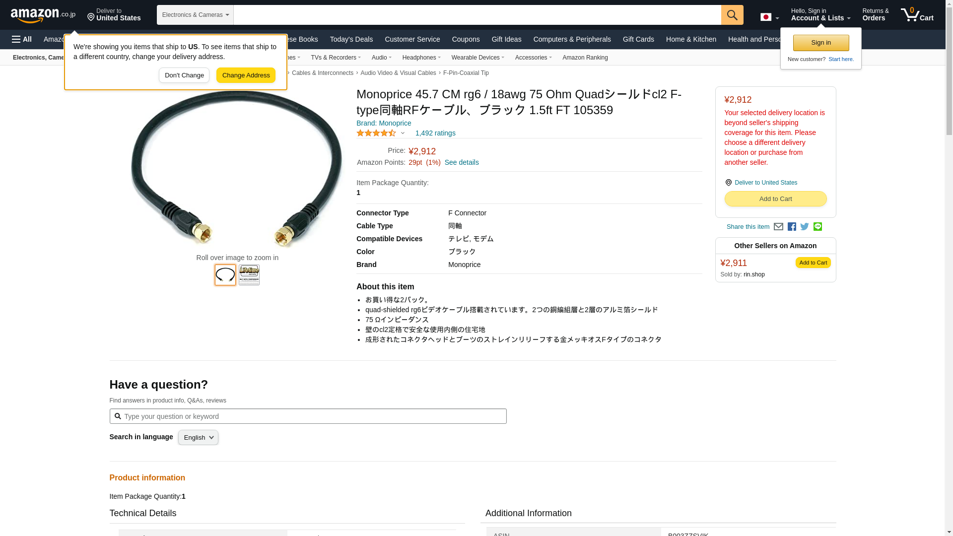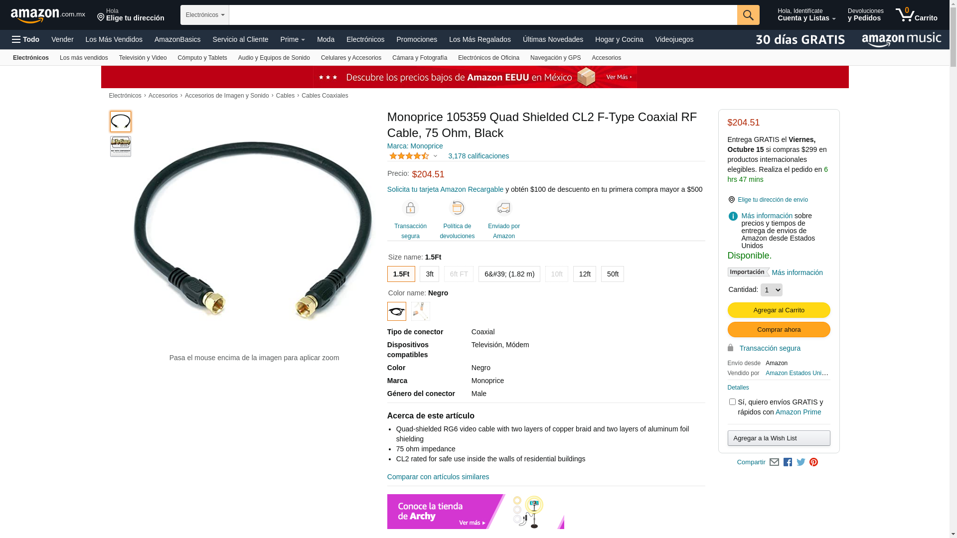 Monoprice RG6 Quad Shield CL2 Coaxial Cable with F Type Connector for Television, 1.5Ft