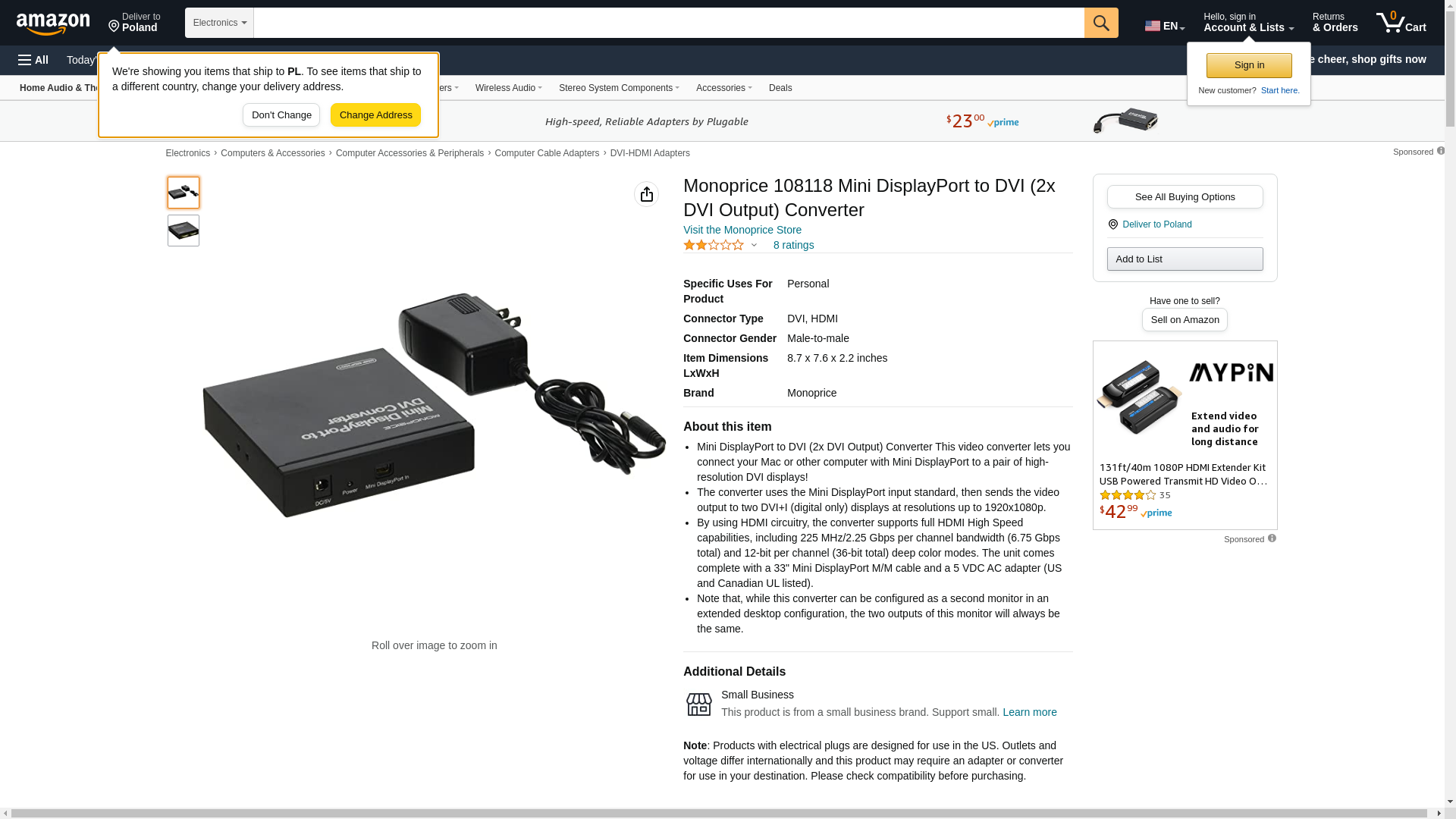 Monoprice 108118 Mini DisplayPort to DVI (2x DVI Output) Converter