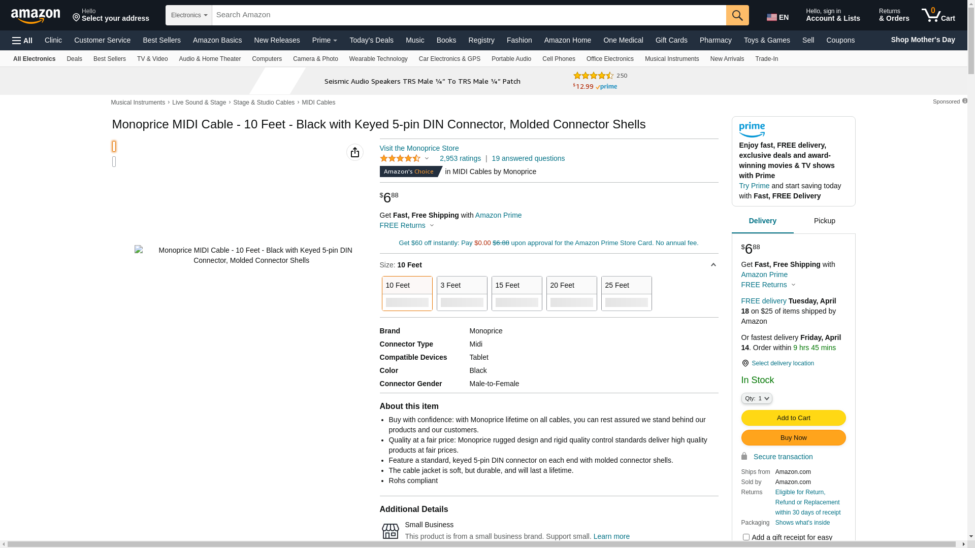 Monoprice MIDI Cable - 5 Pin DIN Connectors, Shielded, Molded Connector Shells, 28 AWG, 10 Feet, Black