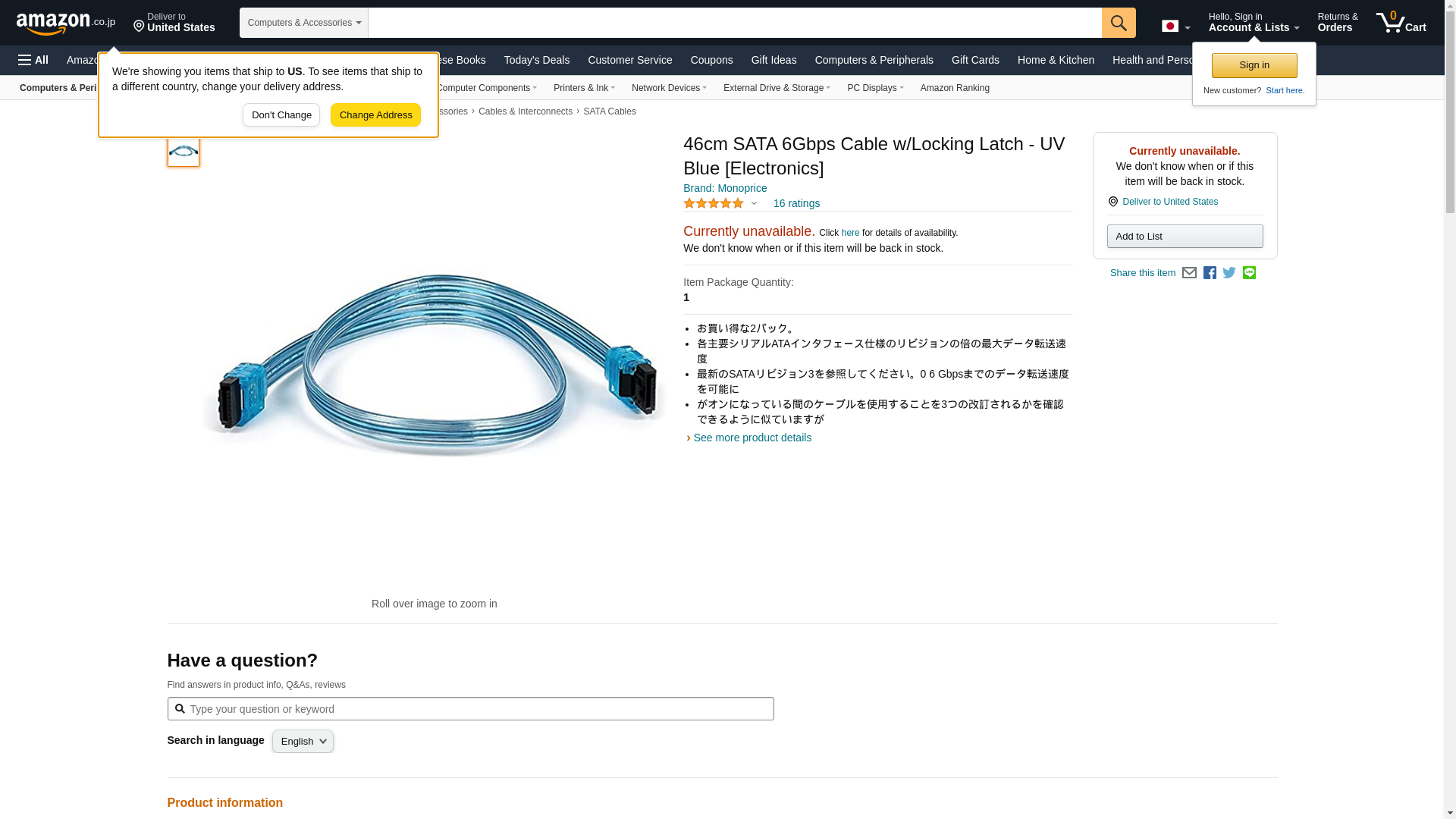 Monoprice 108787 18-Inch SATA 6Gbps Cable with Locking Latch, UV Blue (2 Pack)