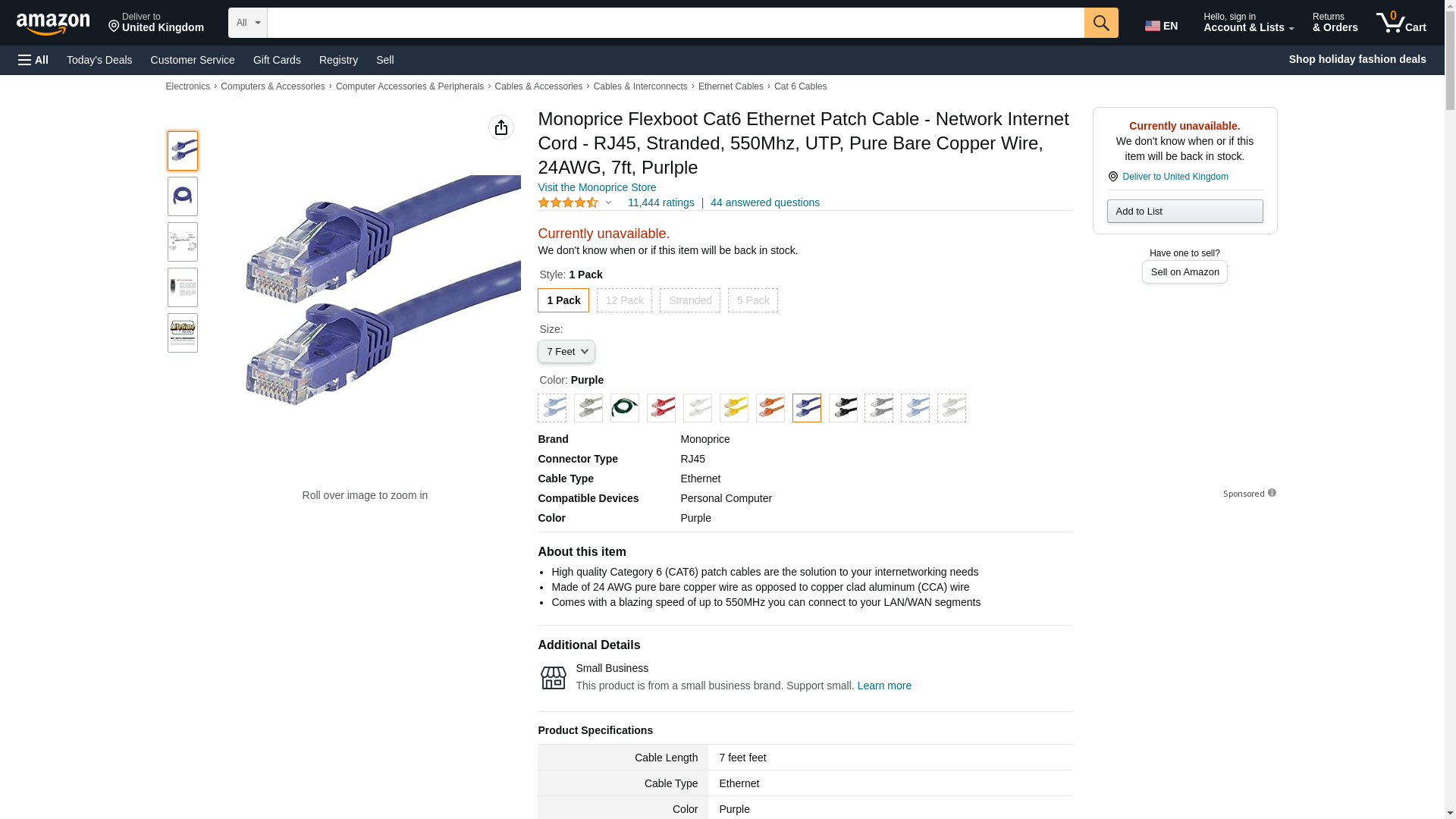 Monoprice Flexboot Cat6 Ethernet Patch Cable - Network Internet Cord - RJ45, Stranded, 550Mhz, UTP, Pure Bare Copper Wire, 24AWG, 7ft, Purlple