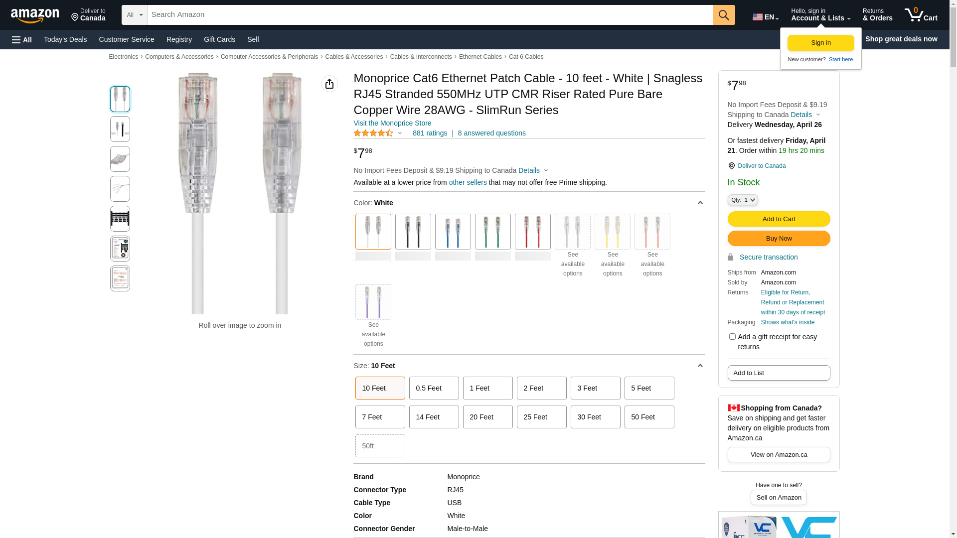 MONOPRICE, INC. 13545 SLIMRUN CAT6 UTP CABLE-10FT WHITE