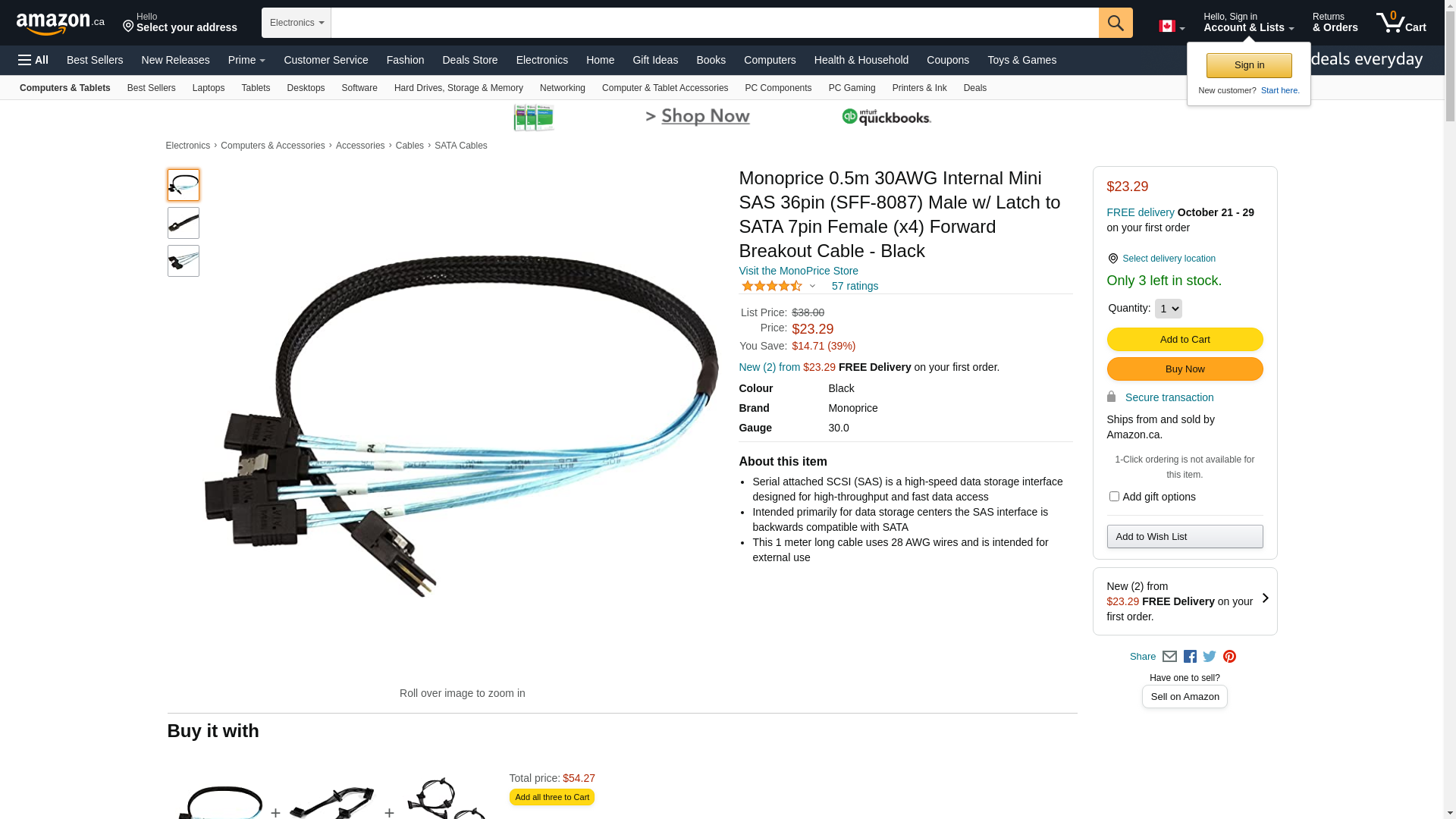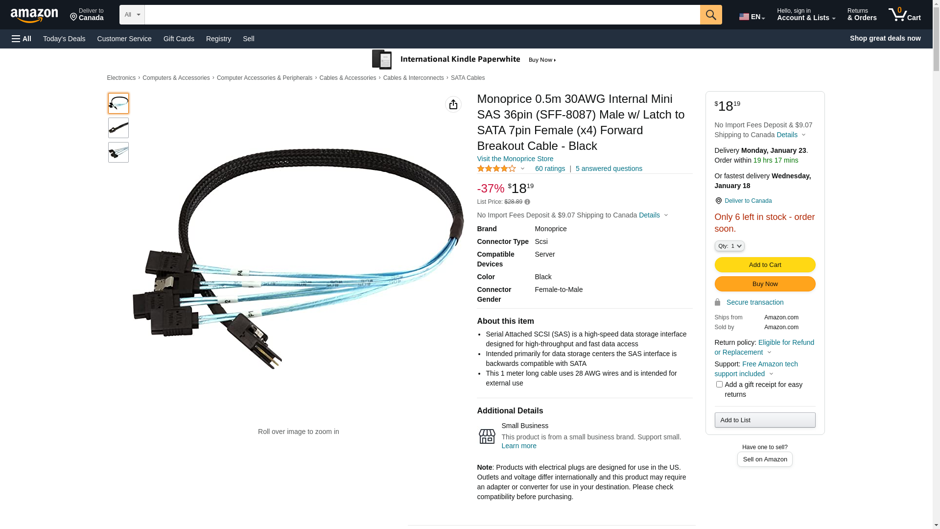 Monoprice 0.5m 30AWG Internal Mini SAS 36pin (SFF-8087) Male w/ Latch to SATA 7pin Female (x4) Forward Breakout Cable - Black