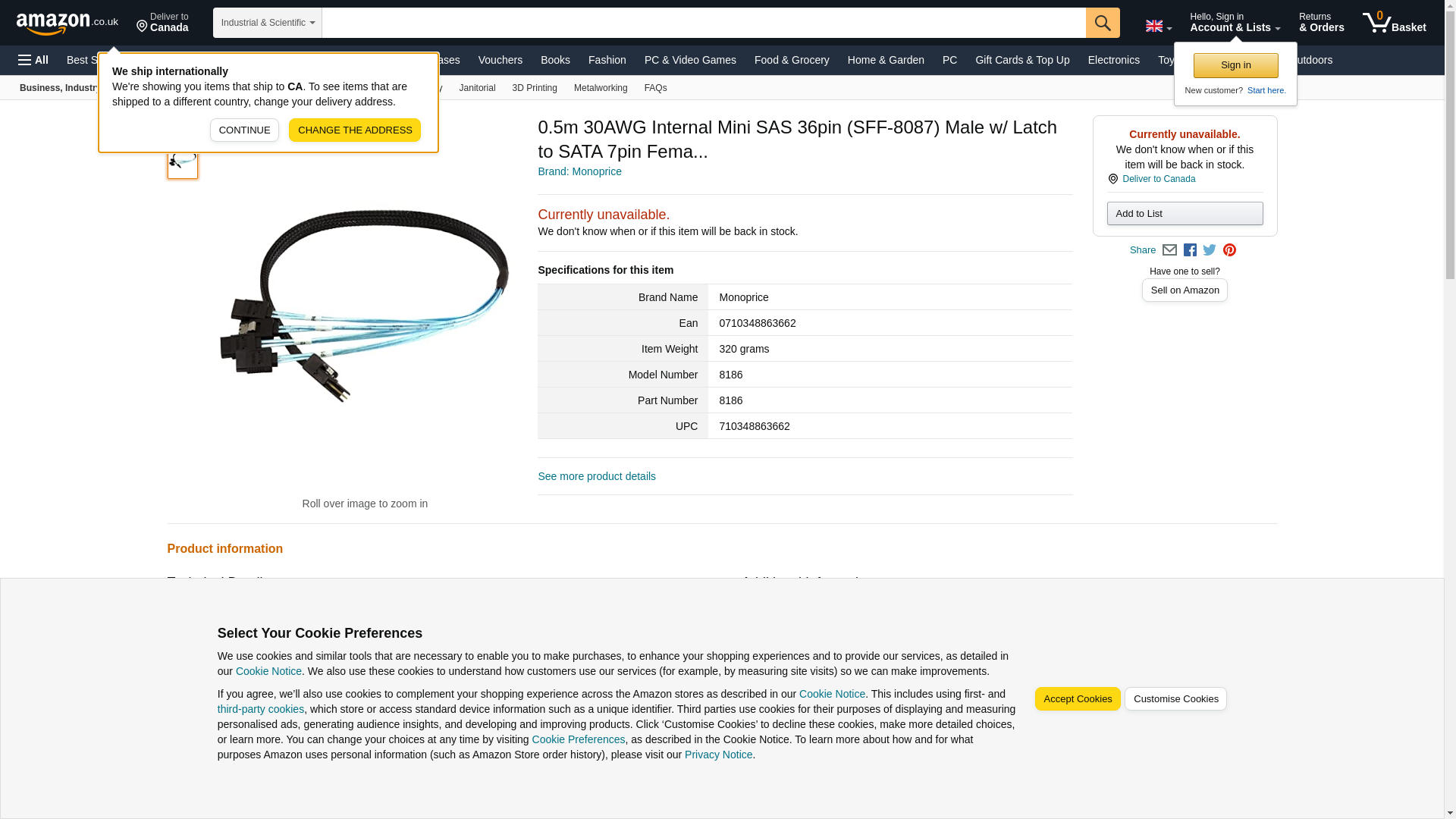 0.5m 30AWG Internal Mini SAS 36pin (SFF-8087) Male w/ Latch to SATA 7pin Fema...