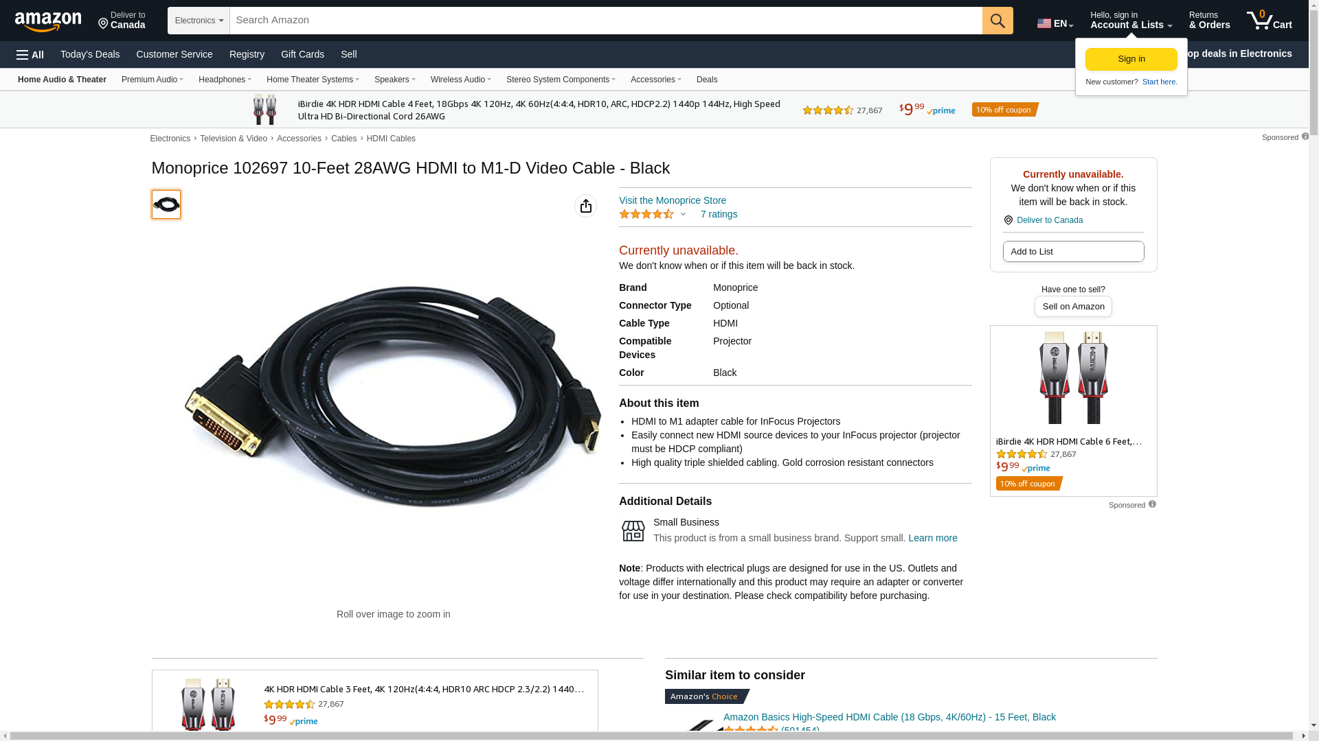 Monoprice 102697 10-Feet 28AWG HDMI to M1-D Video Cable - Black. HDMI to M1 adapter cable for InFocus Projectors. Eas...