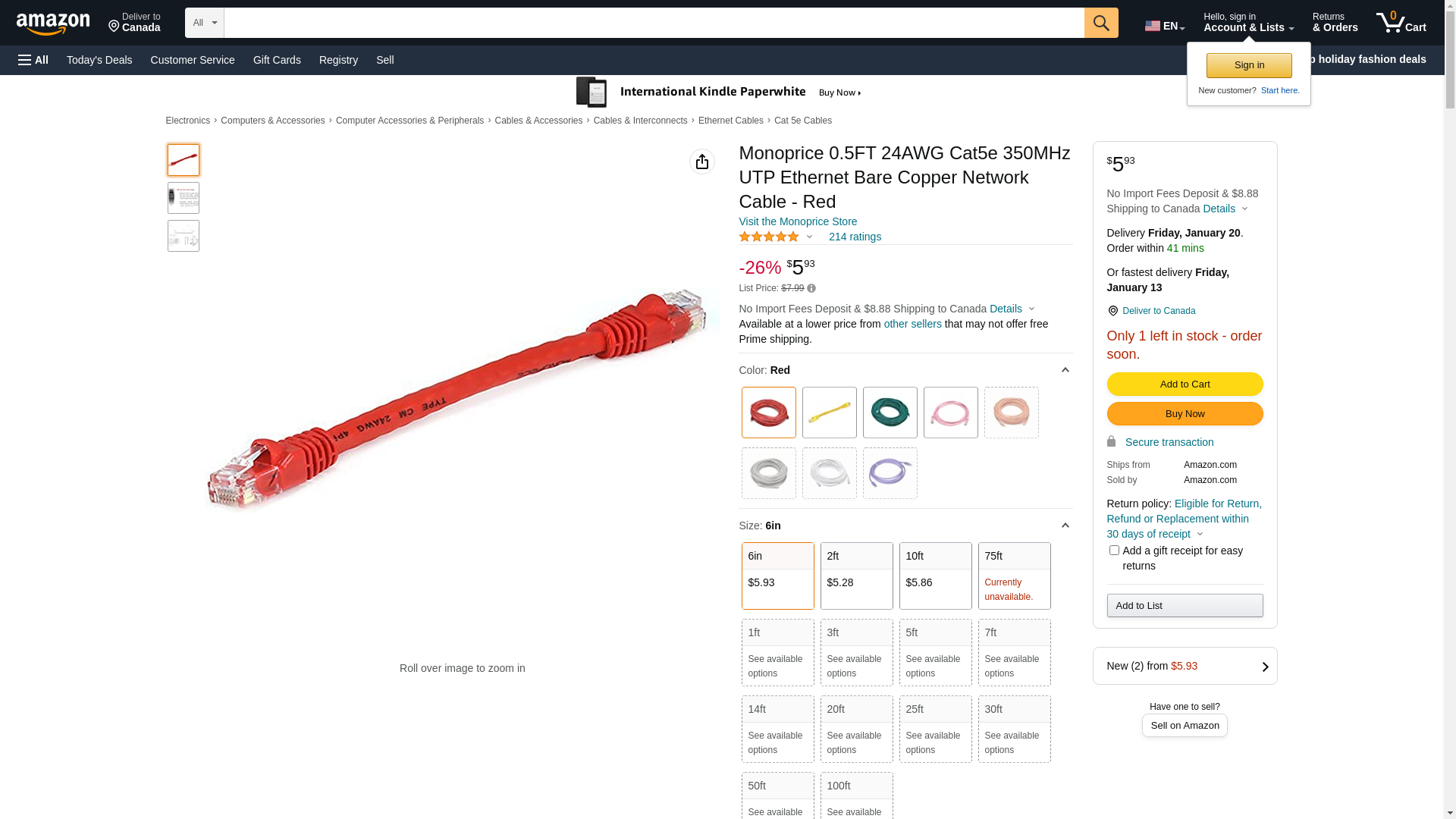 Monoprice 0.5FT 24AWG Cat5e 350MHz UTP Ethernet Bare Copper Network Cable - Red