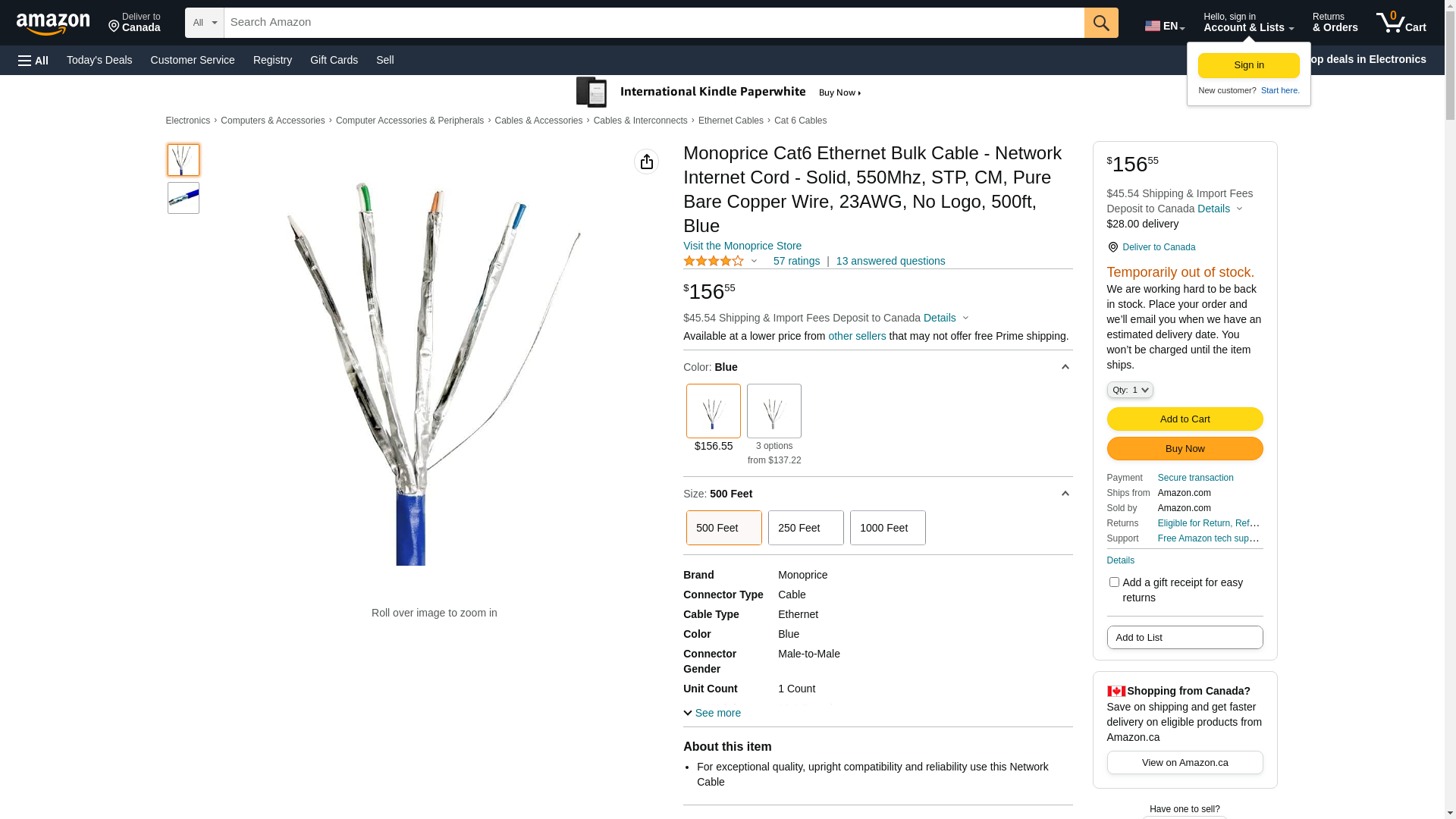 | Feature | Monoprice 500FT Cat 6 Bulk Bare Copper Ethernet Network Cable STP_ Solid_ In-Wall Rated (CM) - Blue - GENERIC (13564) |