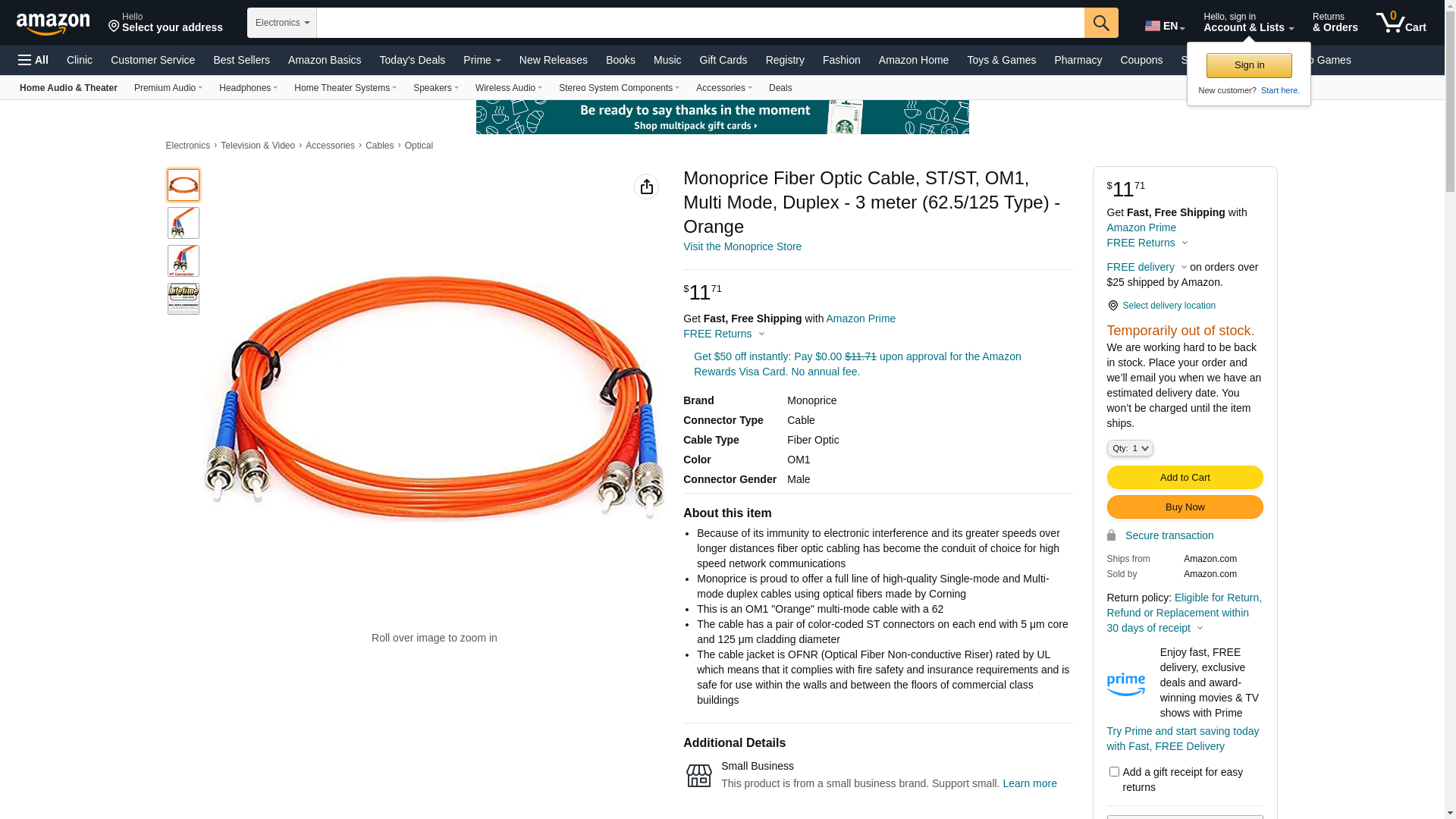 Monoprice Fiber Optic Cable, ST/ST, OM1, Multi Mode, Duplex - 3 meter (62.5/125 Type) - Orange