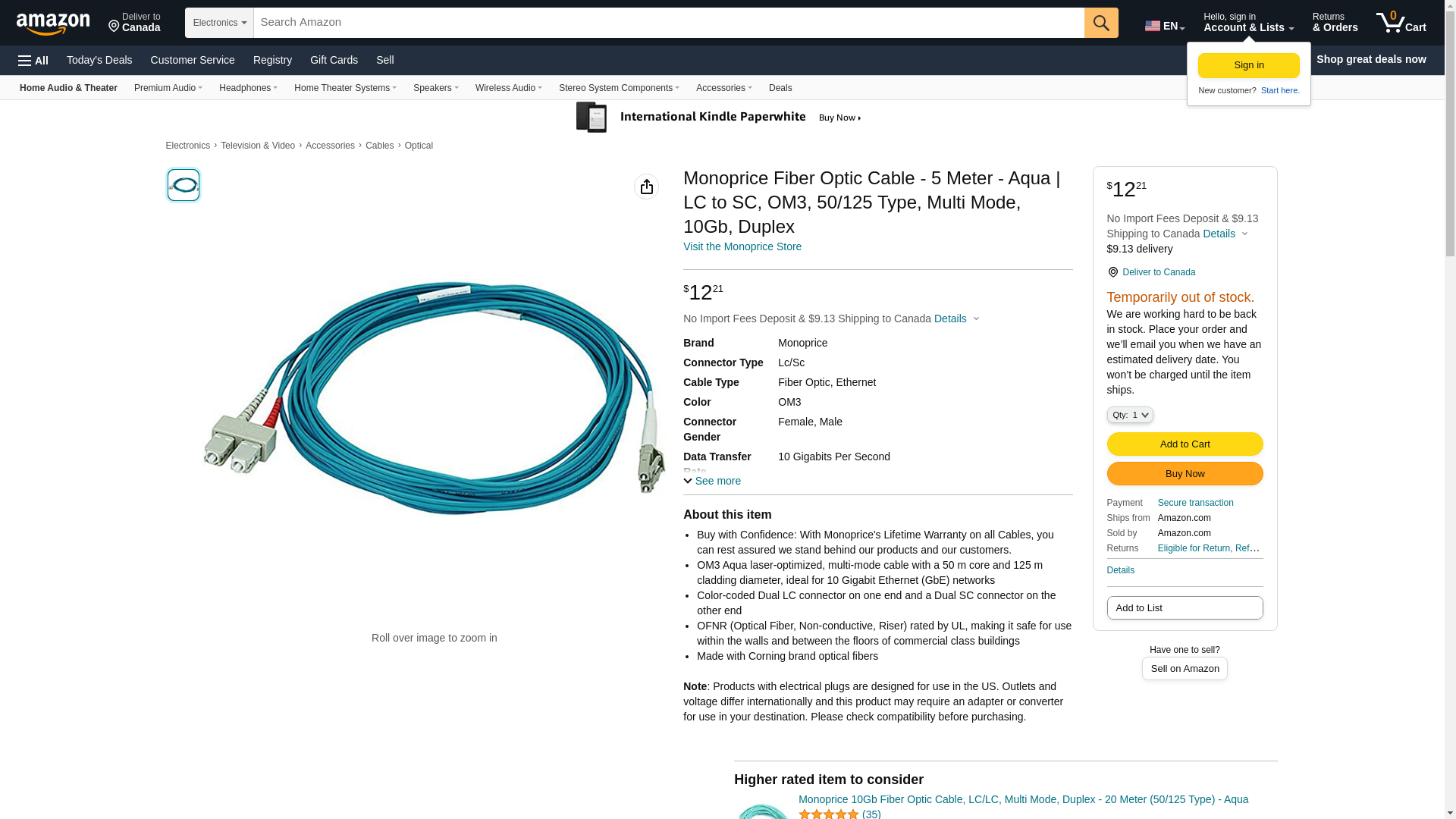 Monoprice Fiber Optic Cable - 5 Meter - Aqua | LC to SC, OM3, 50/125 Type, Multi Mode, 10Gb, Duplex